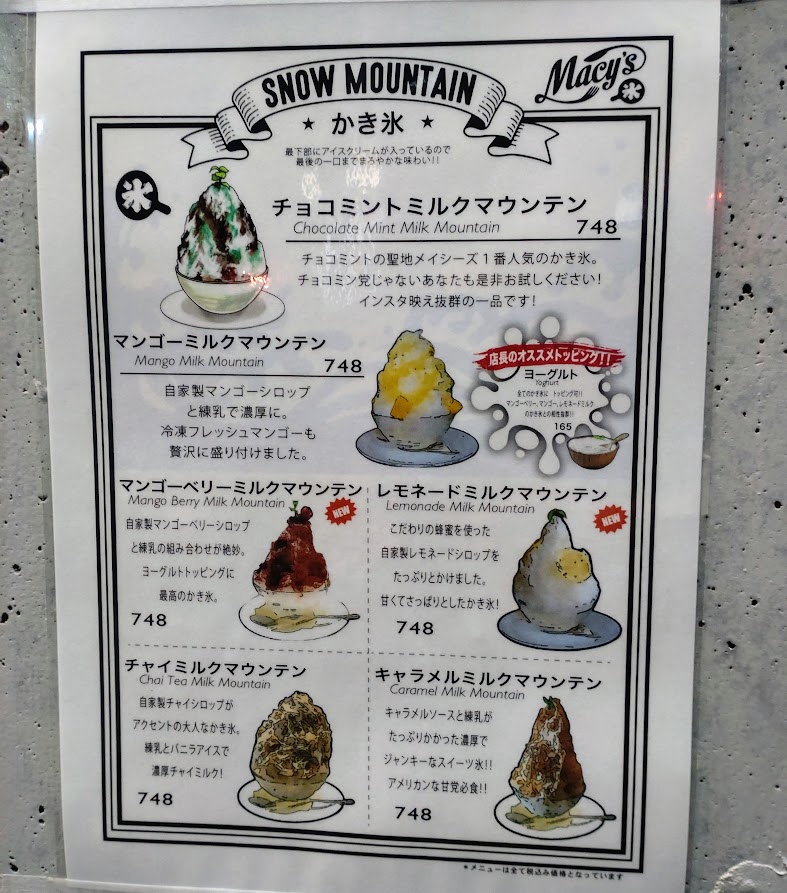 チョコミントミルクマウンテンなどオリジナリティー溢れるかき氷が748円(税込)で食べられます。