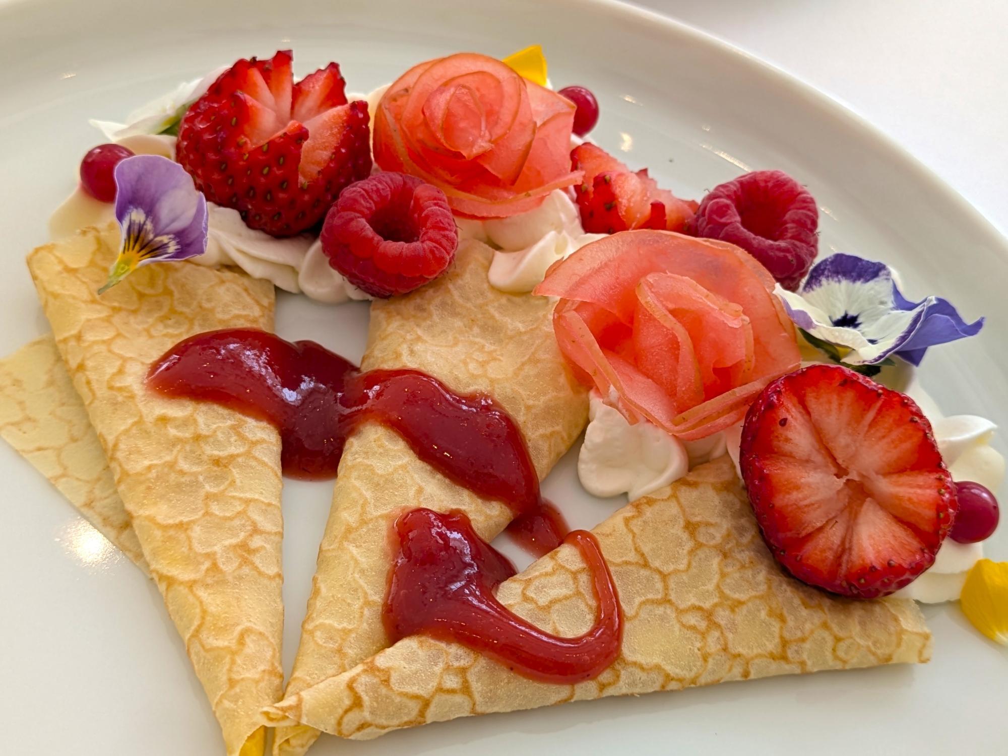 しっとり焼き上げたクレープに、旬のいちごやベリー、エディブルフラワーを束ねた華やかなビジュアルは、まるで“食べられるブーケ”のよう。