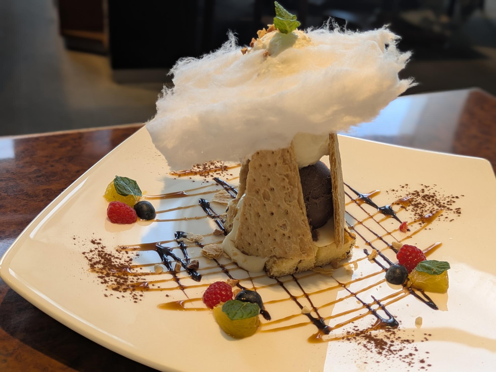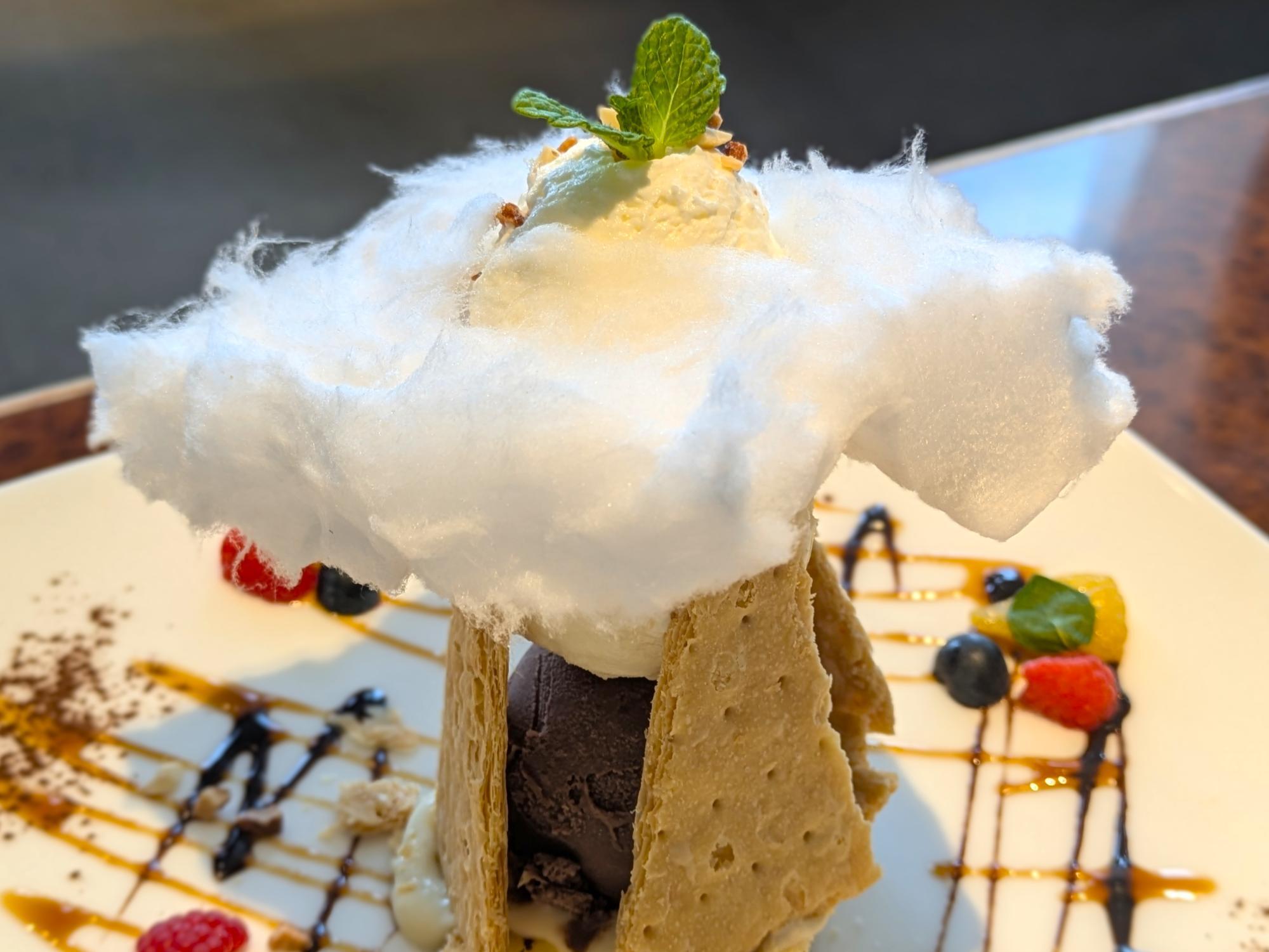 パイの上にふんわりとのった綿菓子が印象的で、まるで“空のカフェ”という店名をそのまま表現したような一皿です。パイの香ばしさとほどよい塩味、アイスのまろやかな甘さがよく合い、軽やかな食感で食後でもぺろりと味わえます。
