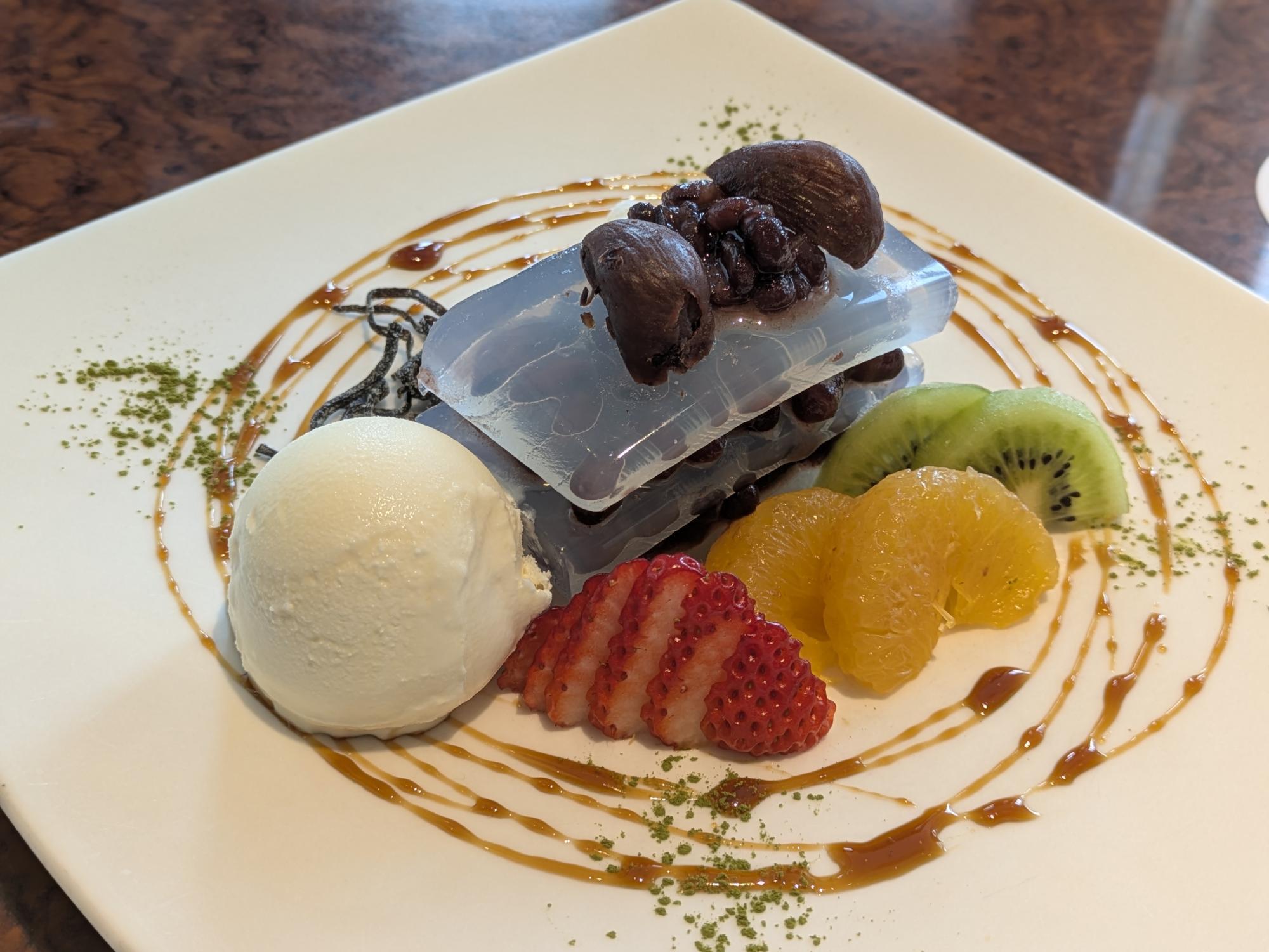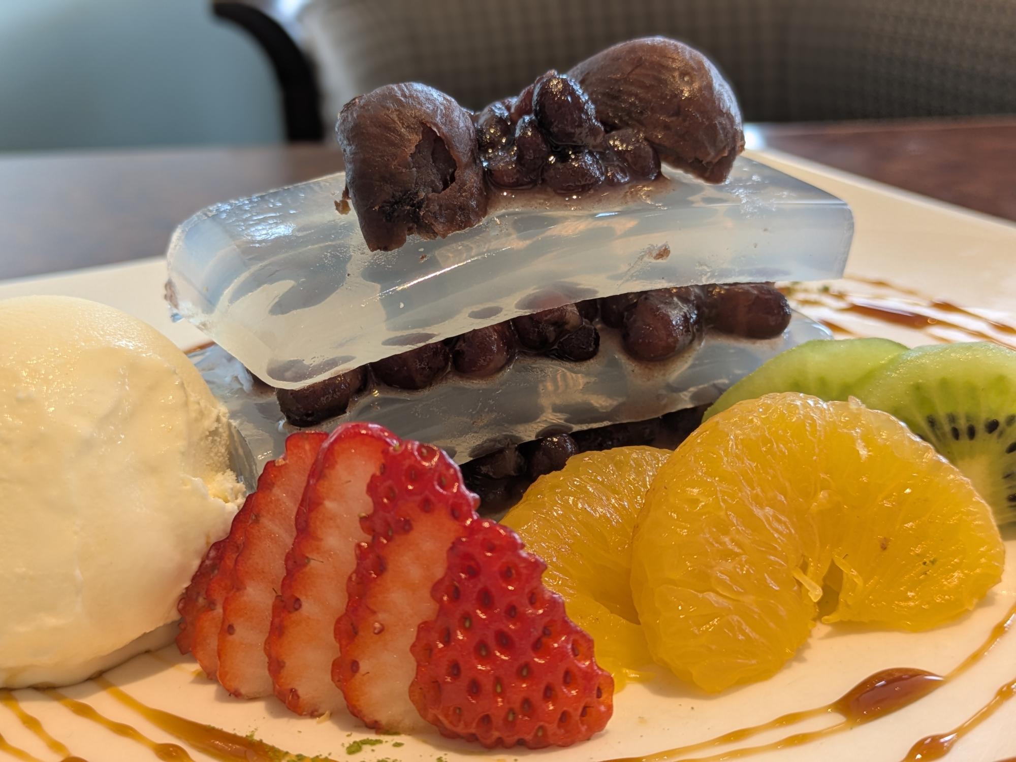 いちごやキウイ、みかんなどのフルーツが爽やかなアクセントになり、最後まで軽やかに食べられます。寒天のぷるもちとした食感が心地よく、あんこの優しい甘さとアイスのまろやかさが重なり、どこか懐かしさのある味わいに仕上がっています。