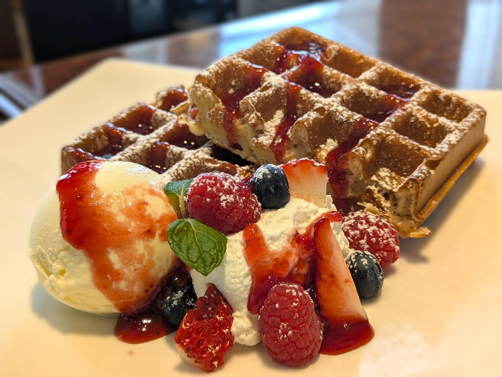 ワッフルも「カフェ・ド・シエル」で人気のメニューです。注文を受けてから丁寧に焼き上げるスタイルで、外はさっくり、中はふんわりとした食感が魅力。フルーツやソースを合わせた華やかな一皿がそろっています。