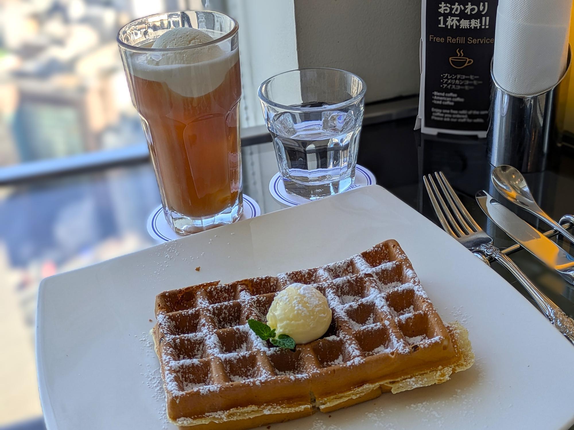 シンプルに楽しみたい方には「プレーンワッフル」(税込990円)もおすすめです。さっくり、ふんわりとした食感が際立つ一皿で、ワッフルそのもののおいしさをしっかり味わえます。席に運ばれてきた瞬間、想像していたより大きくて思わず驚きました。