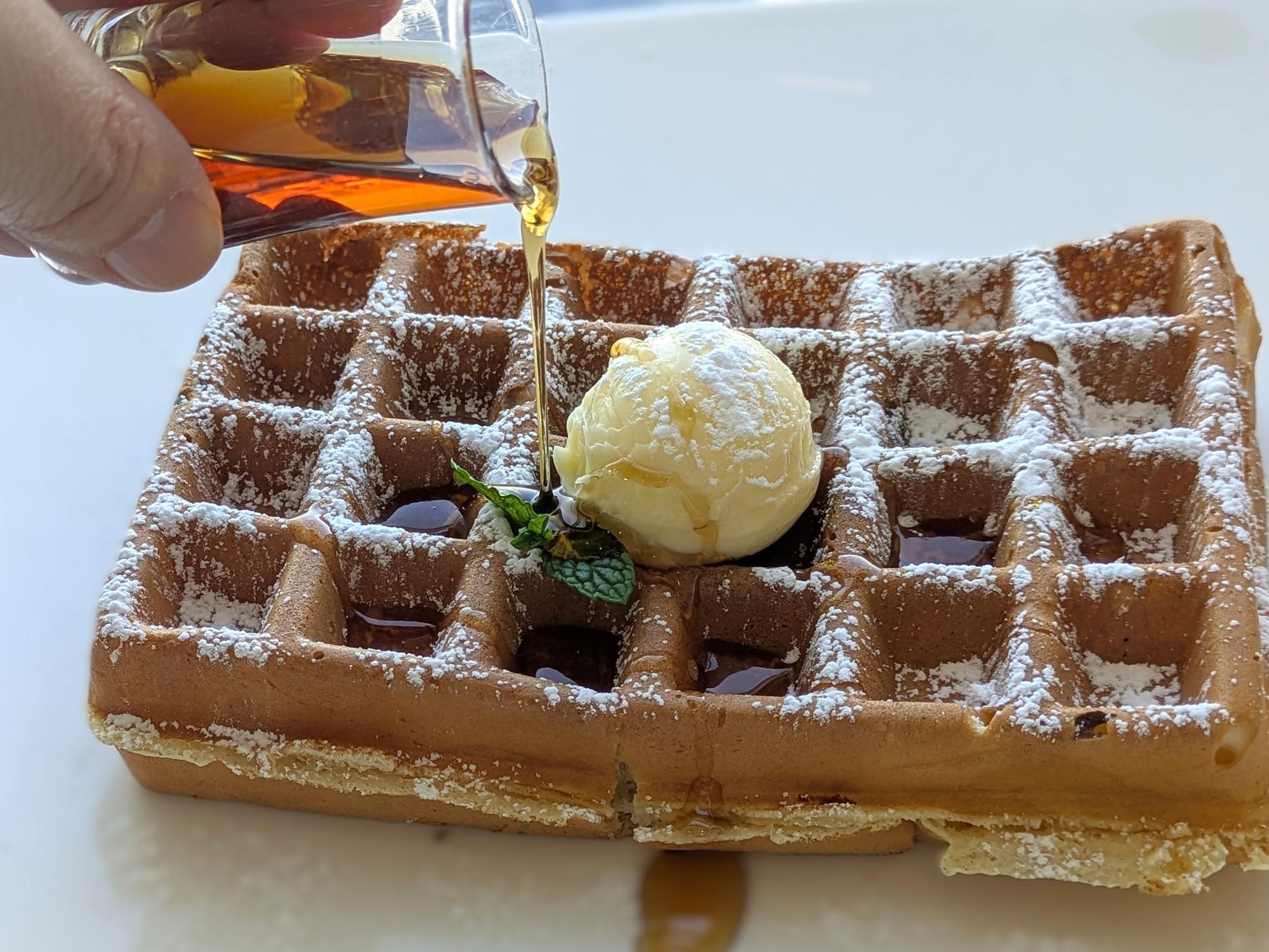 まろやかなバターとシロップをお好みでかけると、香ばしさと甘さが重なり合い、ひと口ごとに幸せが広がります。ワッフル好きにはぜひ味わってほしい一皿です。