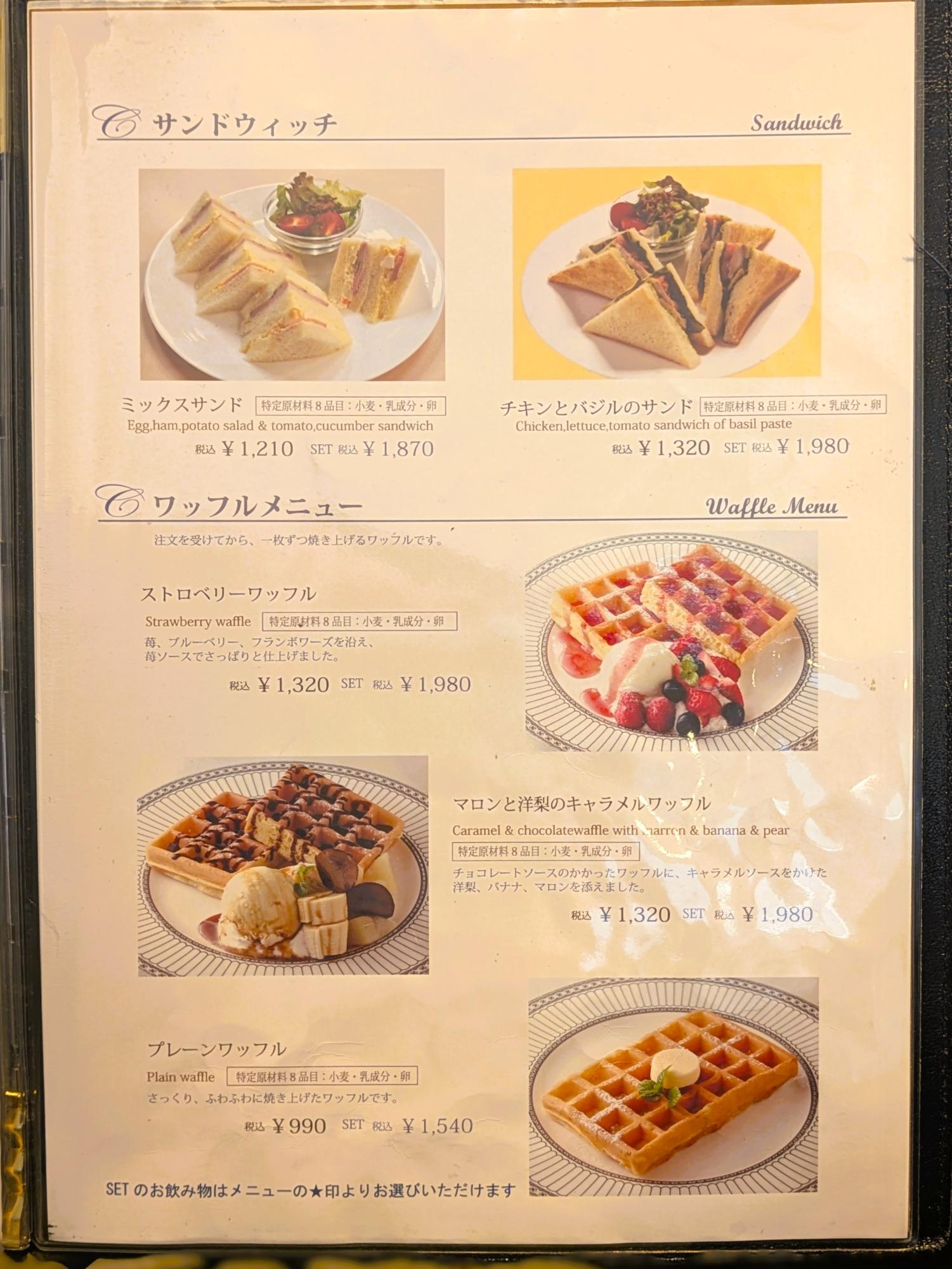 ワッフルもサンドイッチも、単品でもセットでも選べるのが便利。コーヒーは3種類、紅茶は7種類とドリンクの幅も広く、好みに合わせて楽しめます。