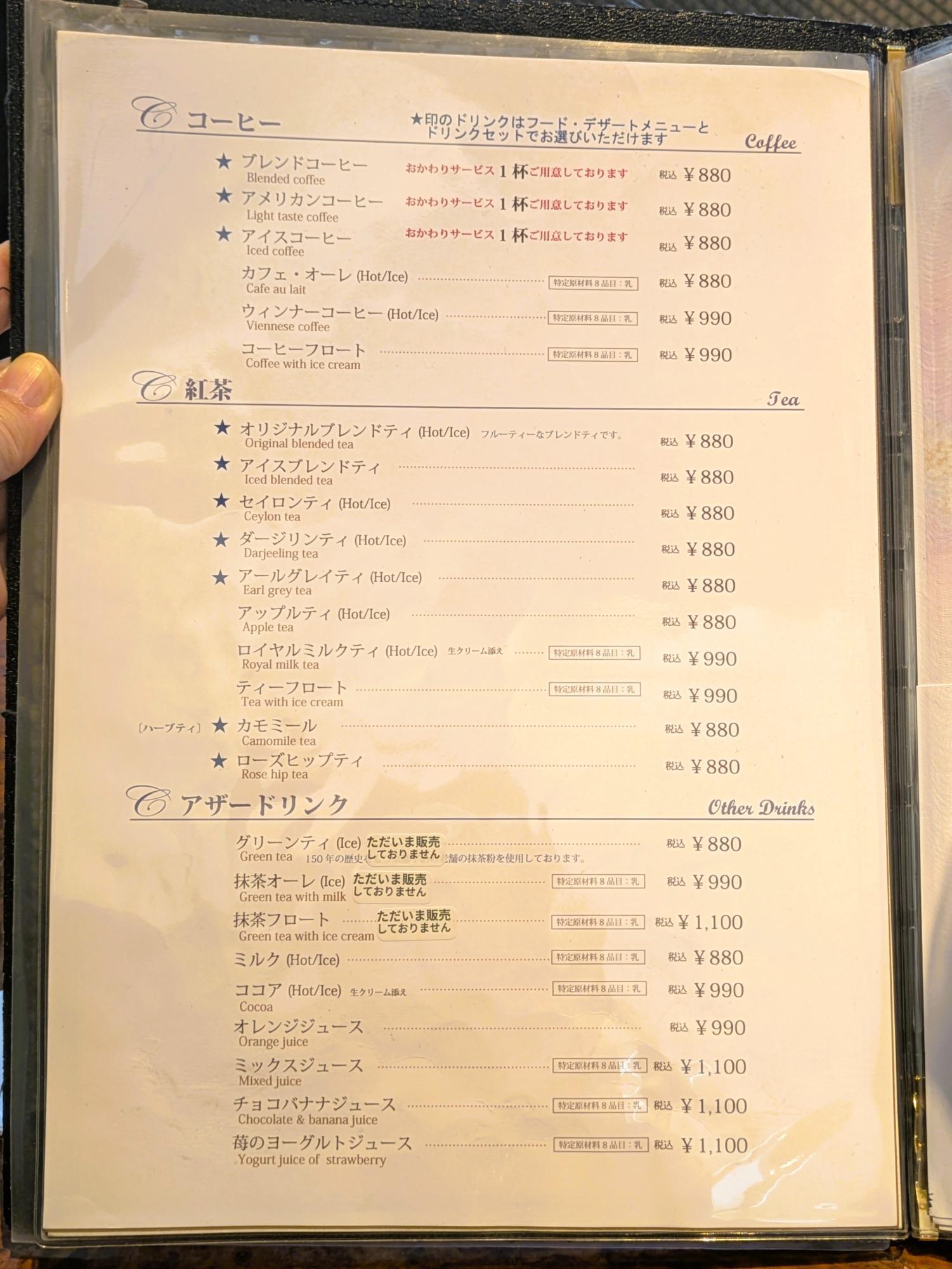 ドリンクメニューも種類が豊富で、コーヒーはブレンドやアメリカン、カフェ・オーレなど全6種類を用意。しっかりめから軽めまで、好みに合わせて選べます。