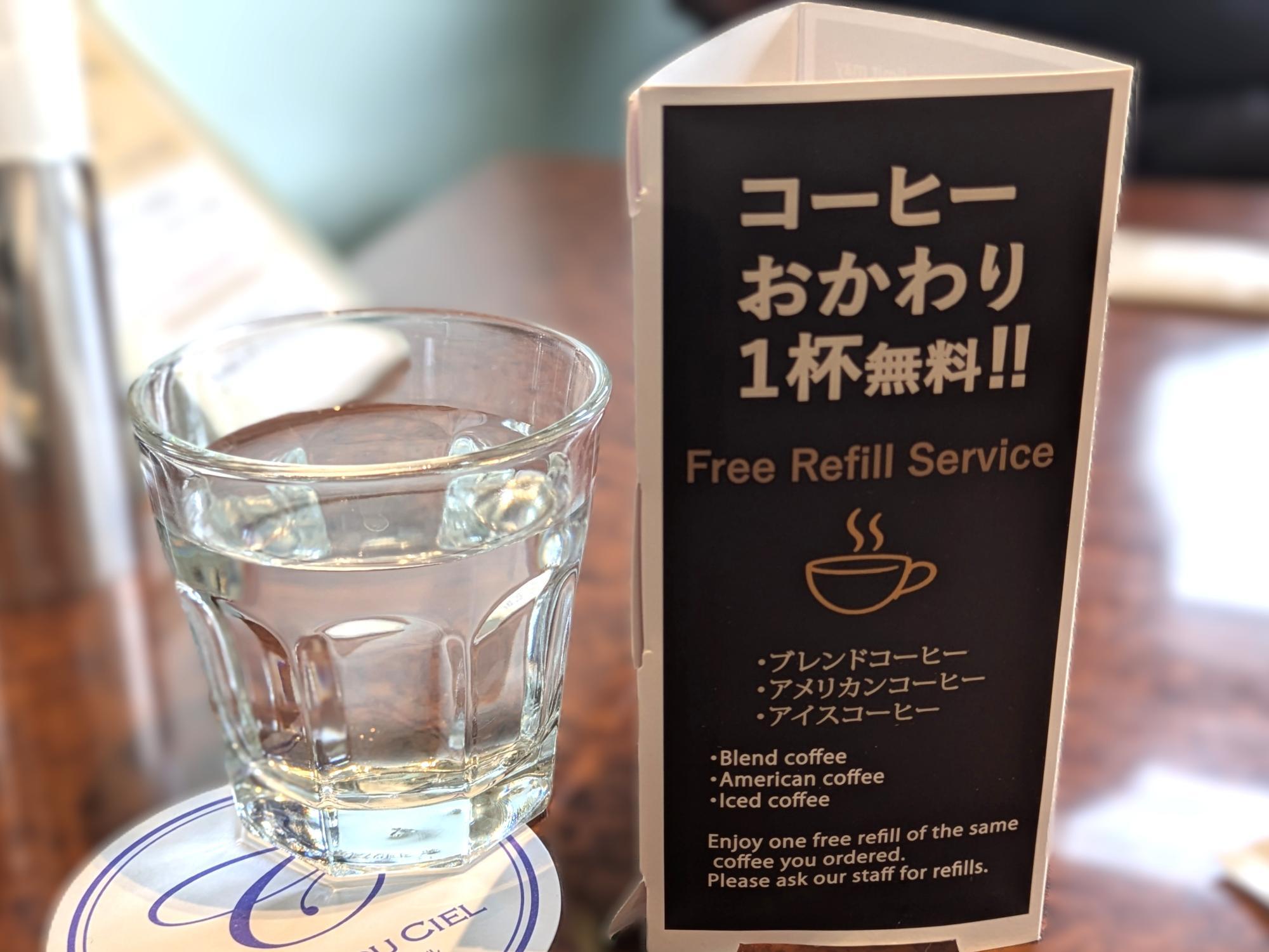 店内では、ブレンドコーヒー、アメリカンコーヒー、アイスコーヒーのいずれかを注文すると、同じ種類のコーヒーを1杯無料でおかわりできます。税込880円で2杯いただけるのは、うれしいサービスです。