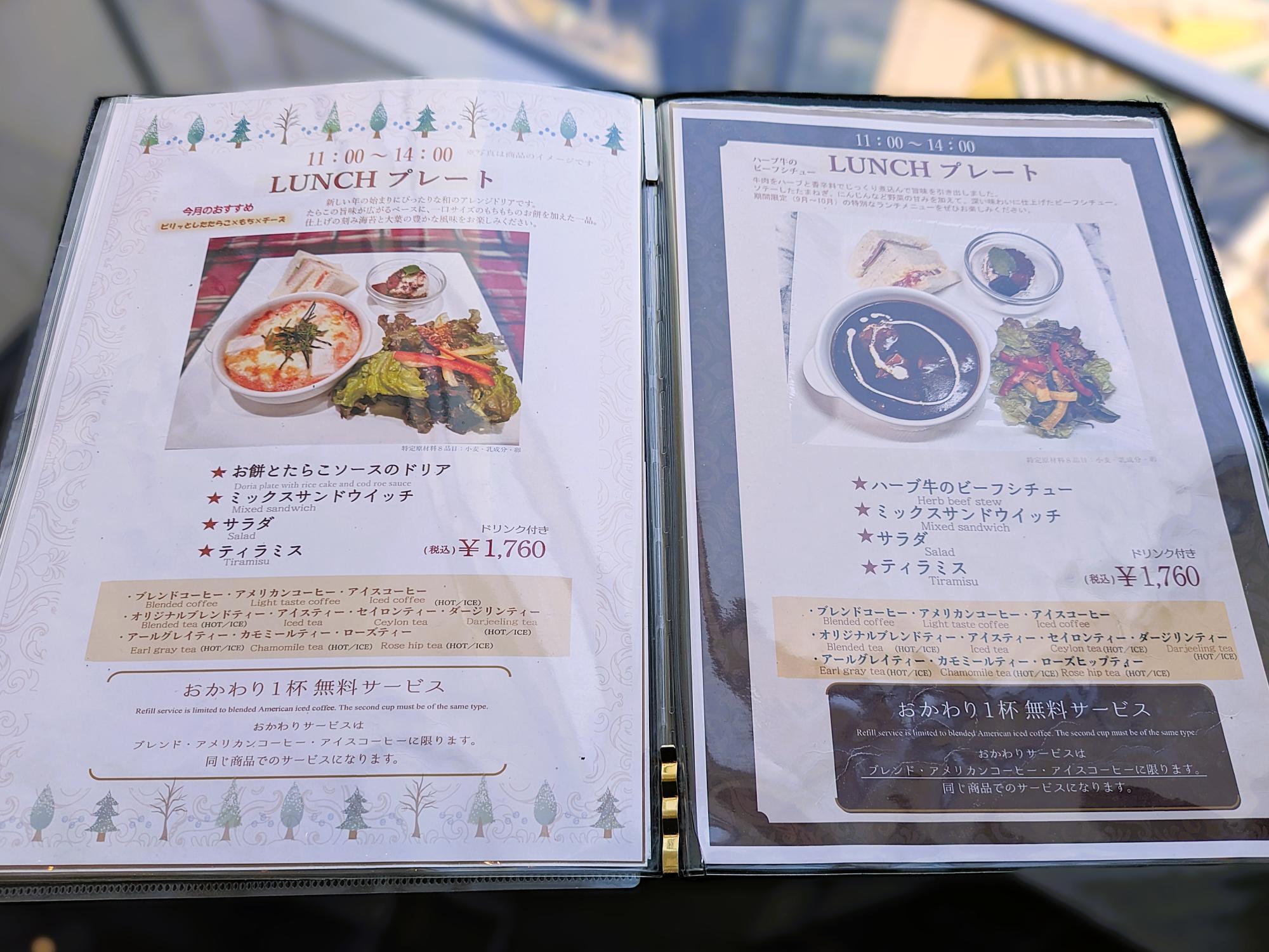 ドリンク付きで税込1,760円と利用しやすく、カフェ利用だけでなく、しっかり食事をしたいときにも便利なお店です。対象のコーヒーはおかわり1杯無料のサービスも利用でき、ゆっくり過ごしたいときにも嬉しいです。