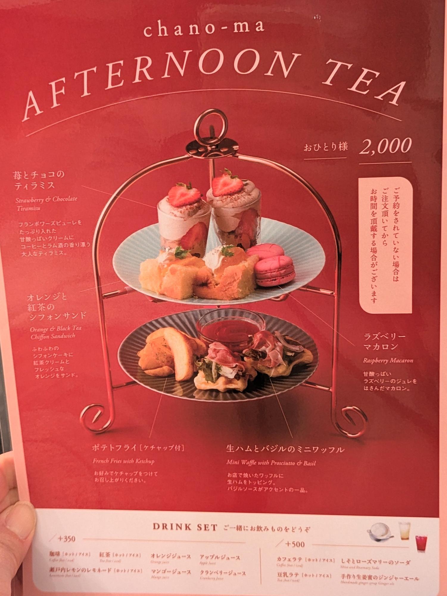 スイーツとセイボリーがバランスよく配置され、見た目にも華やかで上品なボリューム感。価格は税込2,000円で、ドリンクは別注文ですが、紅茶やカフェラテなどを気分に合わせて選べるのも『chano-ma』ならではの魅力です。