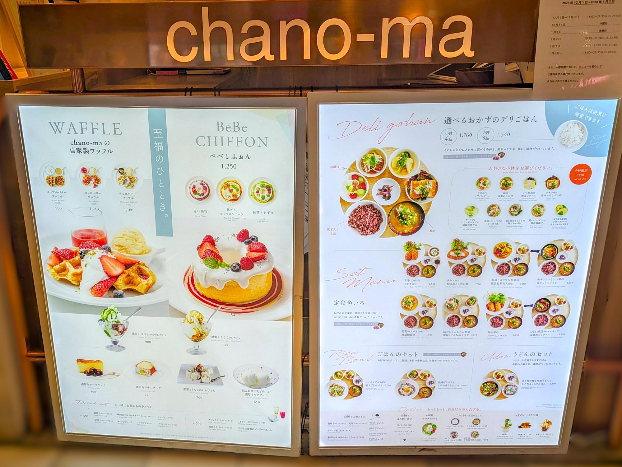 「自家製ワッフル」や「べべしふぉん」など、見た目にも華やかなスイーツが並ぶ『chano-ma』。 「選べるおかずのデリごはん」などの食事メニューも揃っていて、甘いものを楽しみたいときも、お腹を満たしたいときも頼れる存在です。
