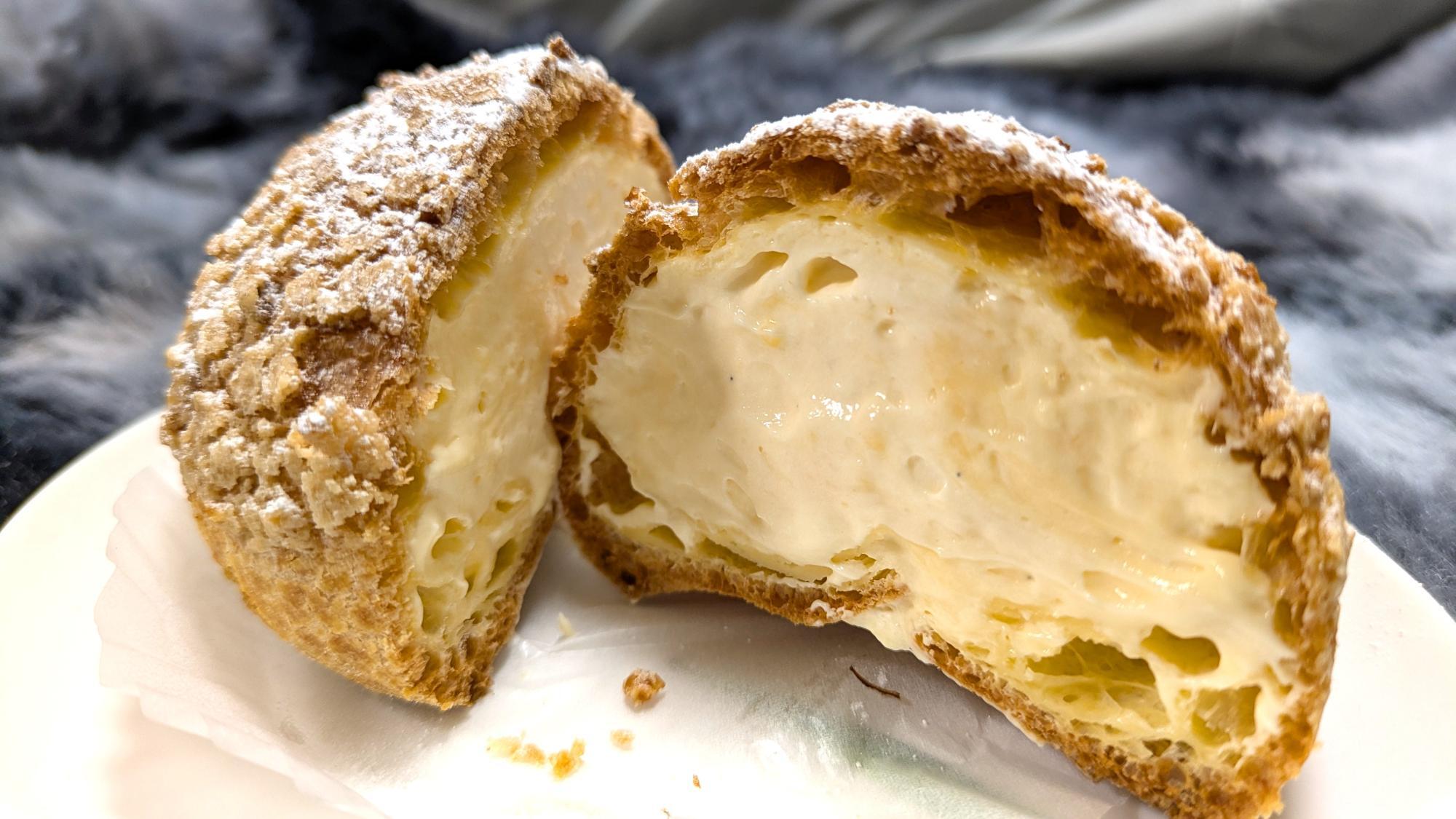シュー皮の上に刻みアーモンドとクッキーを乗せて焼き上げ、中にはたっぷりのディプロマットクリーム(カスタードクリームとホイップクリームを混ぜたクリーム)が詰まっています。