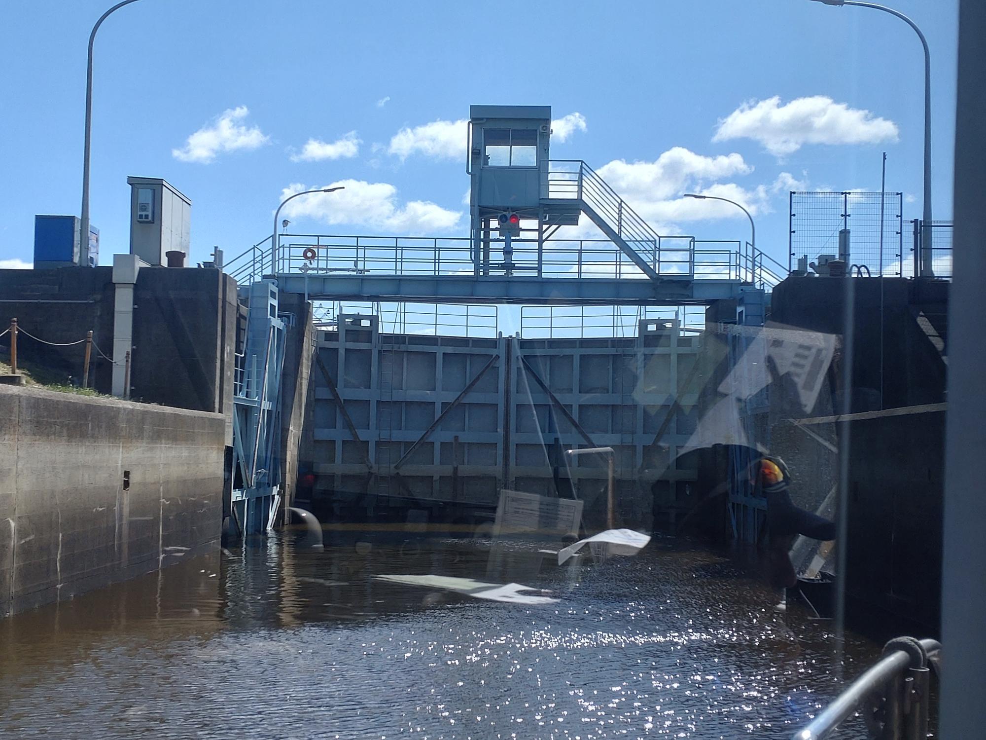 通船門は、水門で仕切られた閘室内の水位を上下に調整することにより、船の通航を可能にしているそうです。