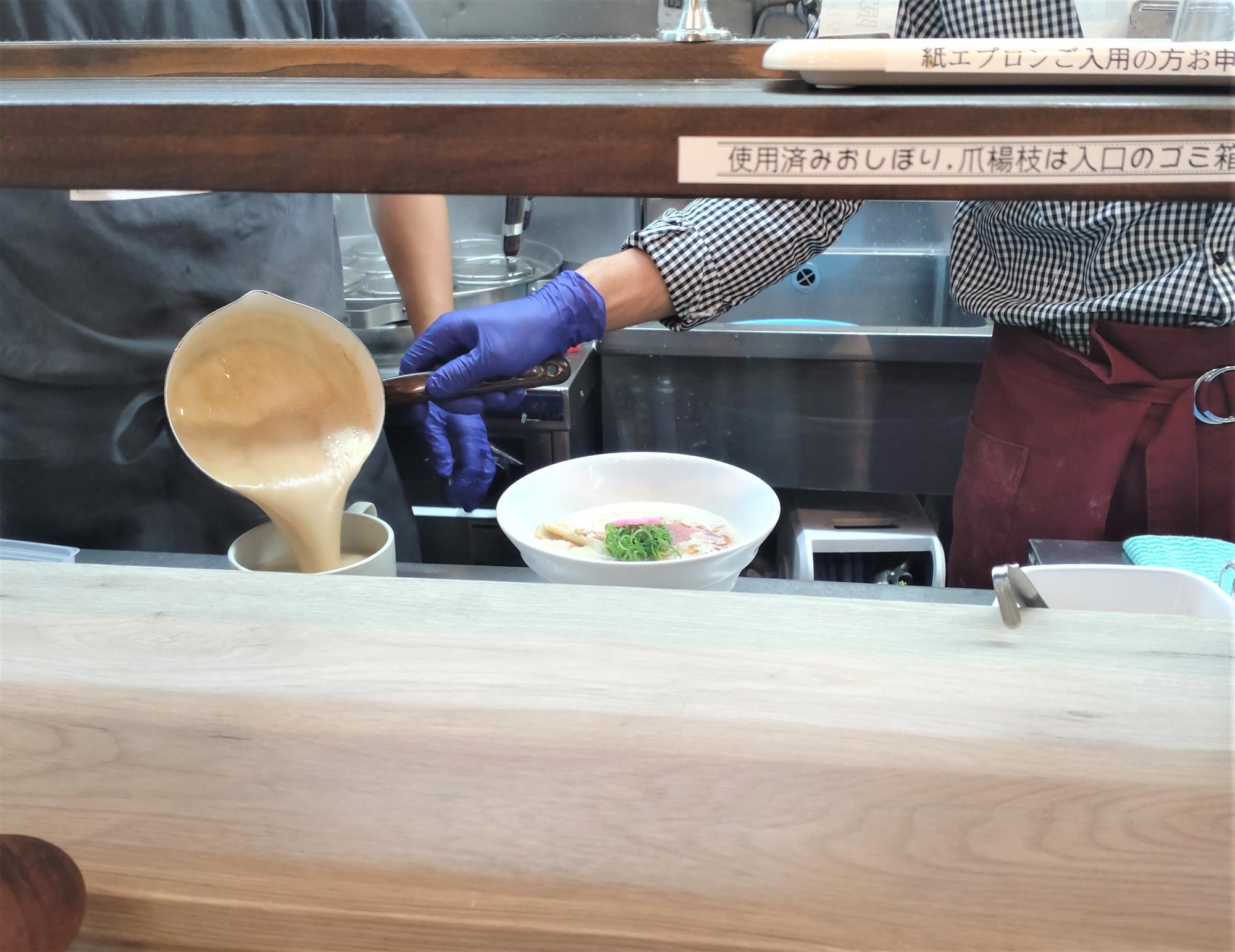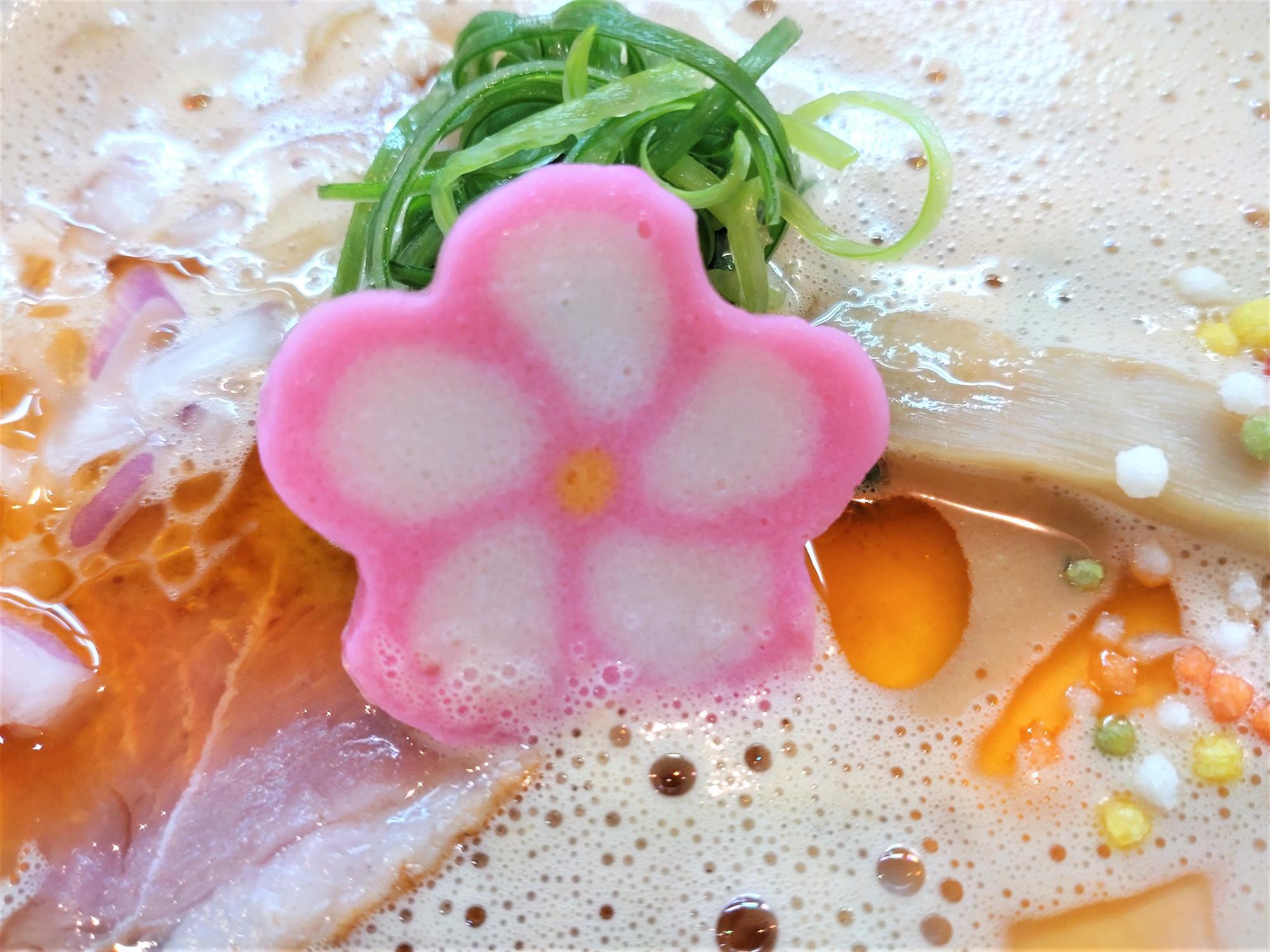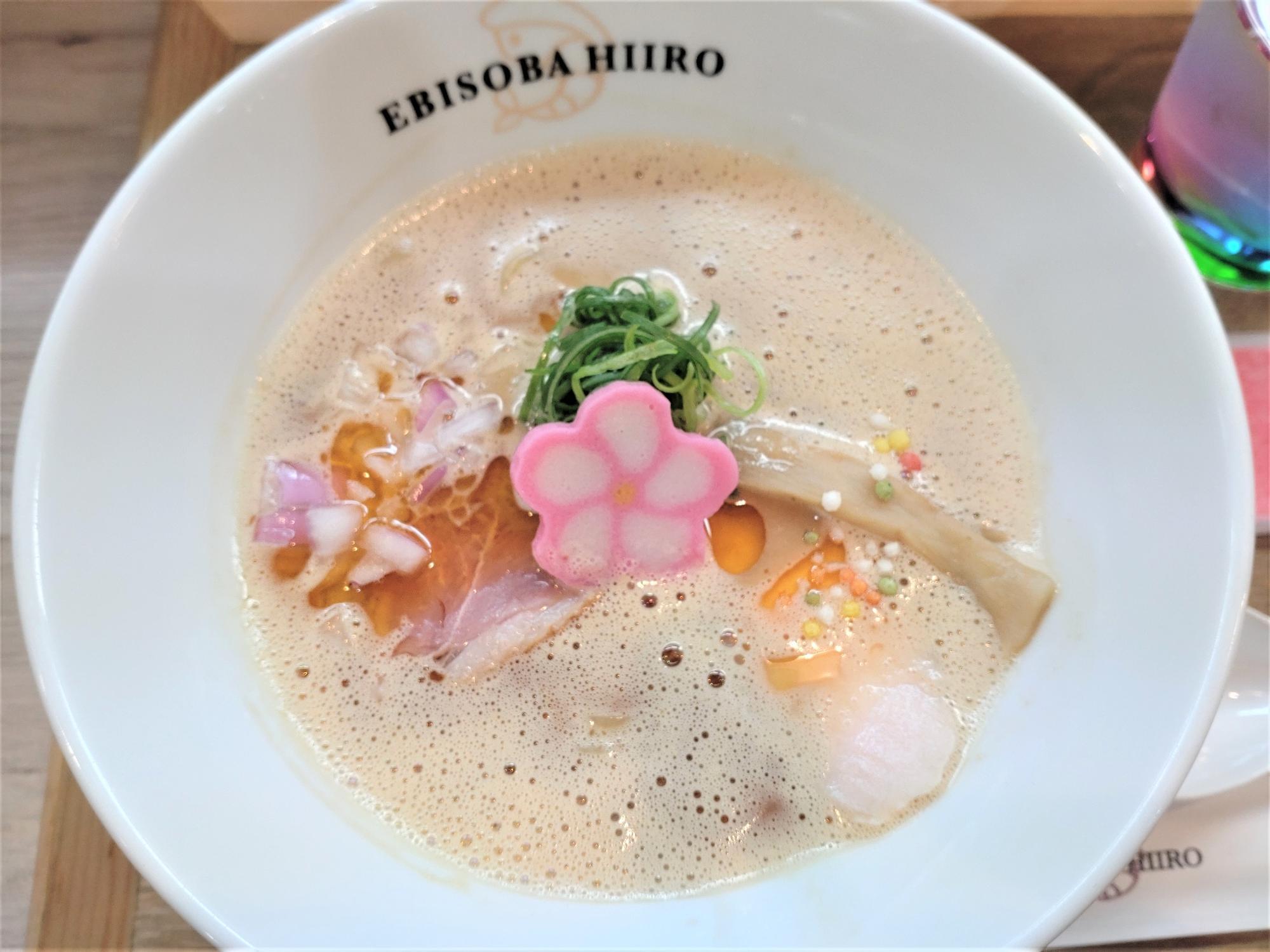 海老白湯と魚介出汁のスープで、お花も乗っていて可愛らしさもある見た目です。
