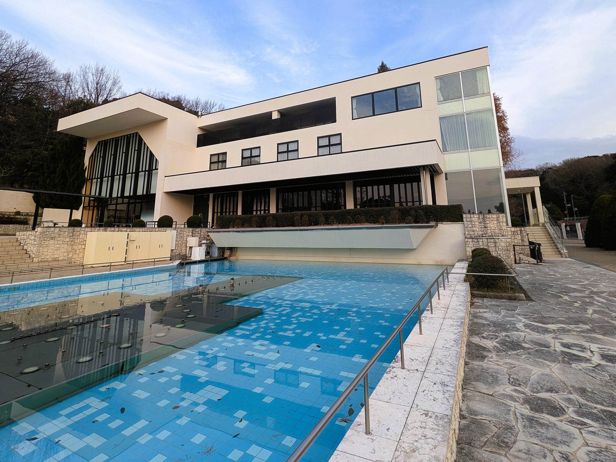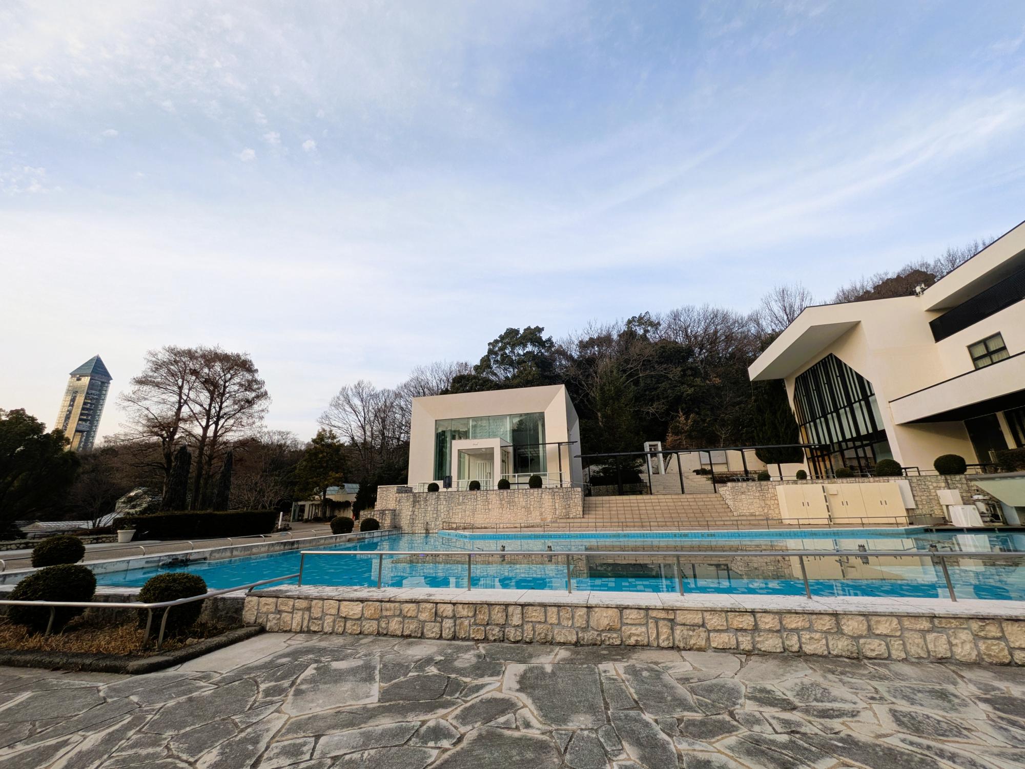 本日アフタヌーンティーを楽しむ「RESTAURANT STRIA」は、名古屋・東山動植物園の敷地内に佇む白を基調としたモダンな建築。 自然の緑と調和した静かな空間の中、目の前には噴水と青白のモザイクが美しいプールが広がり、冬の澄んだ空気がより一層その景色を引き立てています。