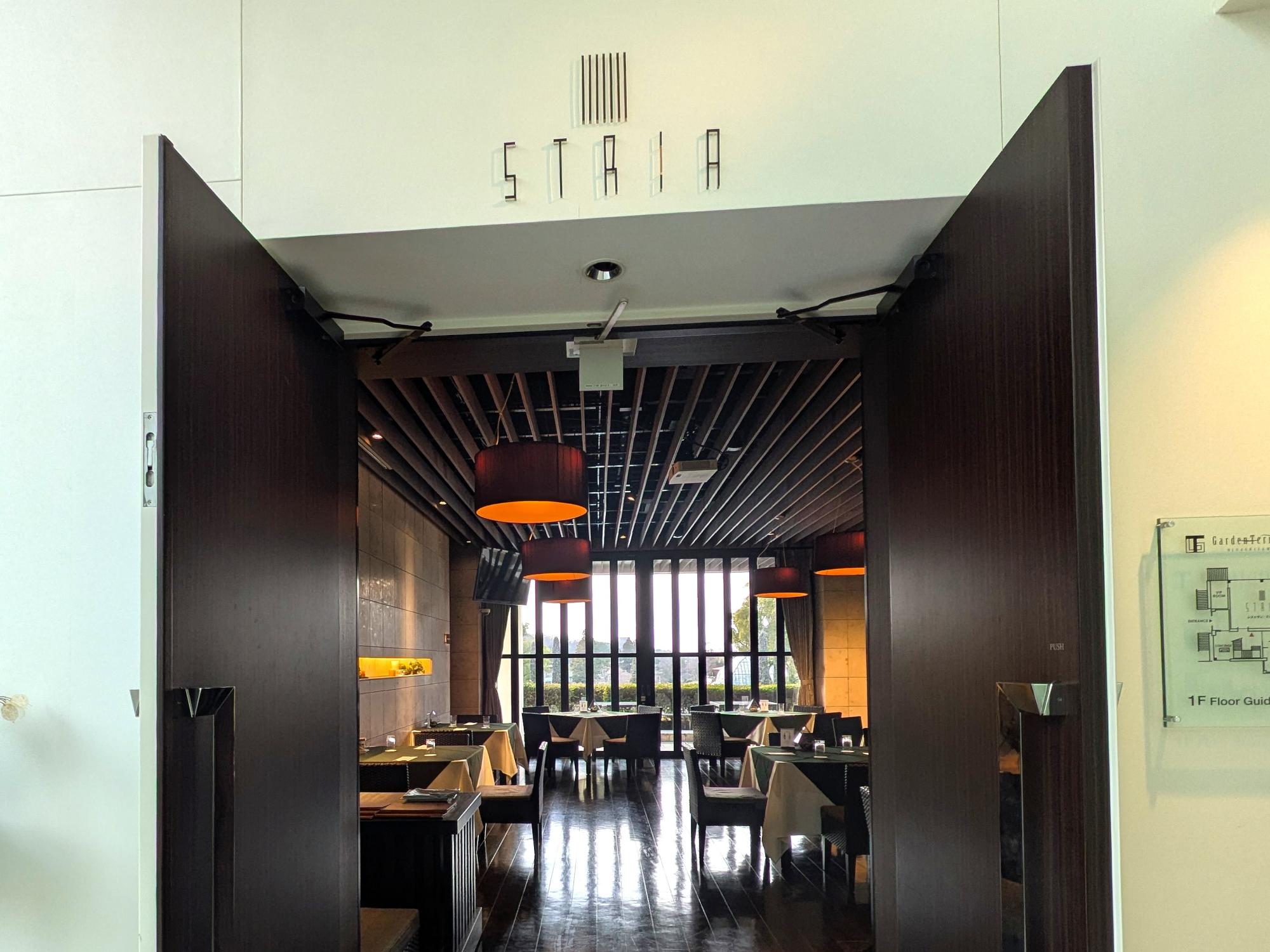 「RESTAURANT STRIA」のエントランスは、洗練された静けさと温もりが同居する佇まい。 重厚なダークウッドの扉が開くと、落ち着いた色調でまとめられた上質な空間が広がり、木の温もりがやさしく迎えてくれます。