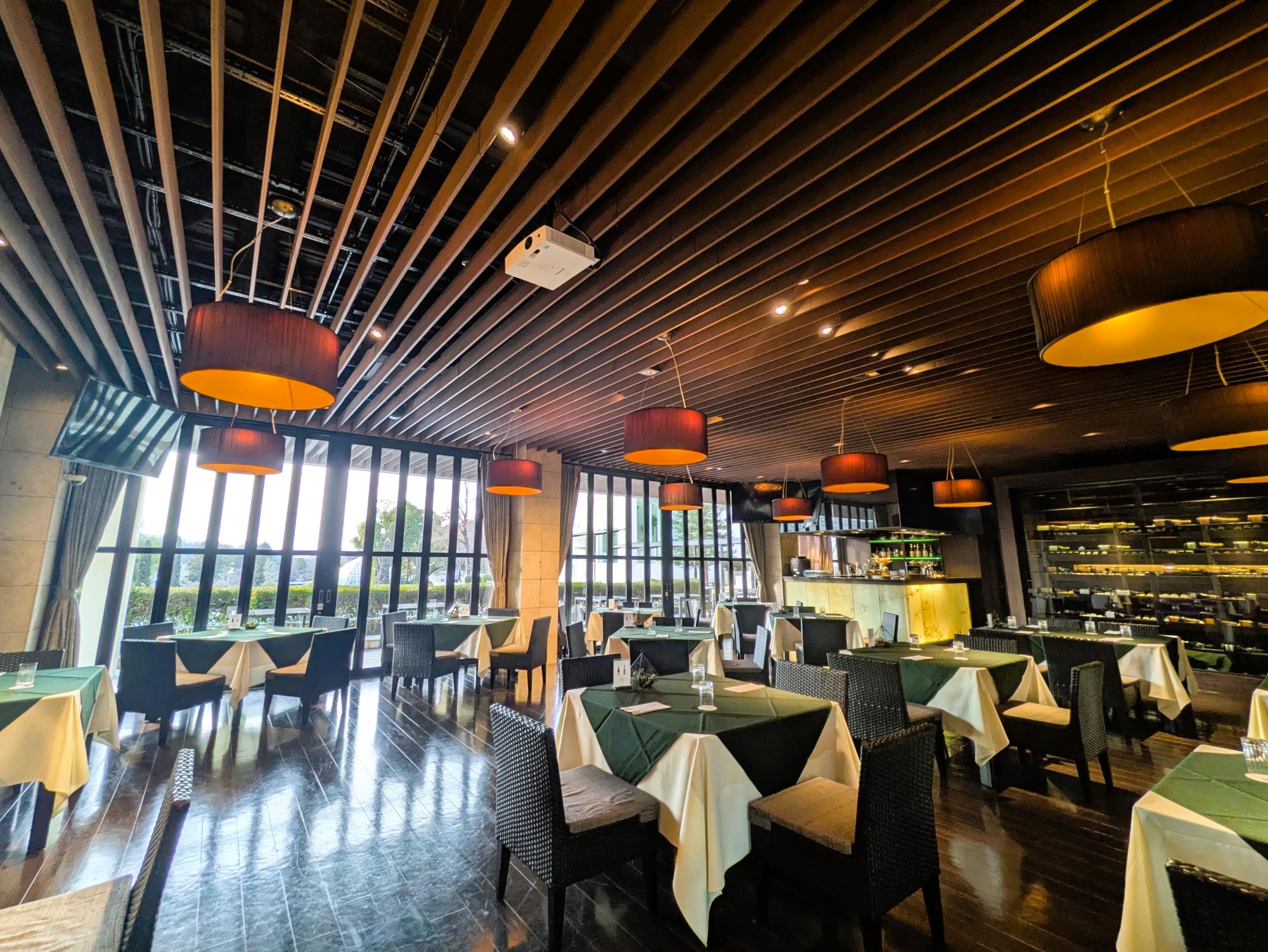 店内には、ダークウッドの床にグリーンとホワイトのクロスが映えるテーブルが整然と並び、天井のペンダントライトが柔らかなオレンジ色の光を落として、空間全体を穏やかに包み込んでいます。