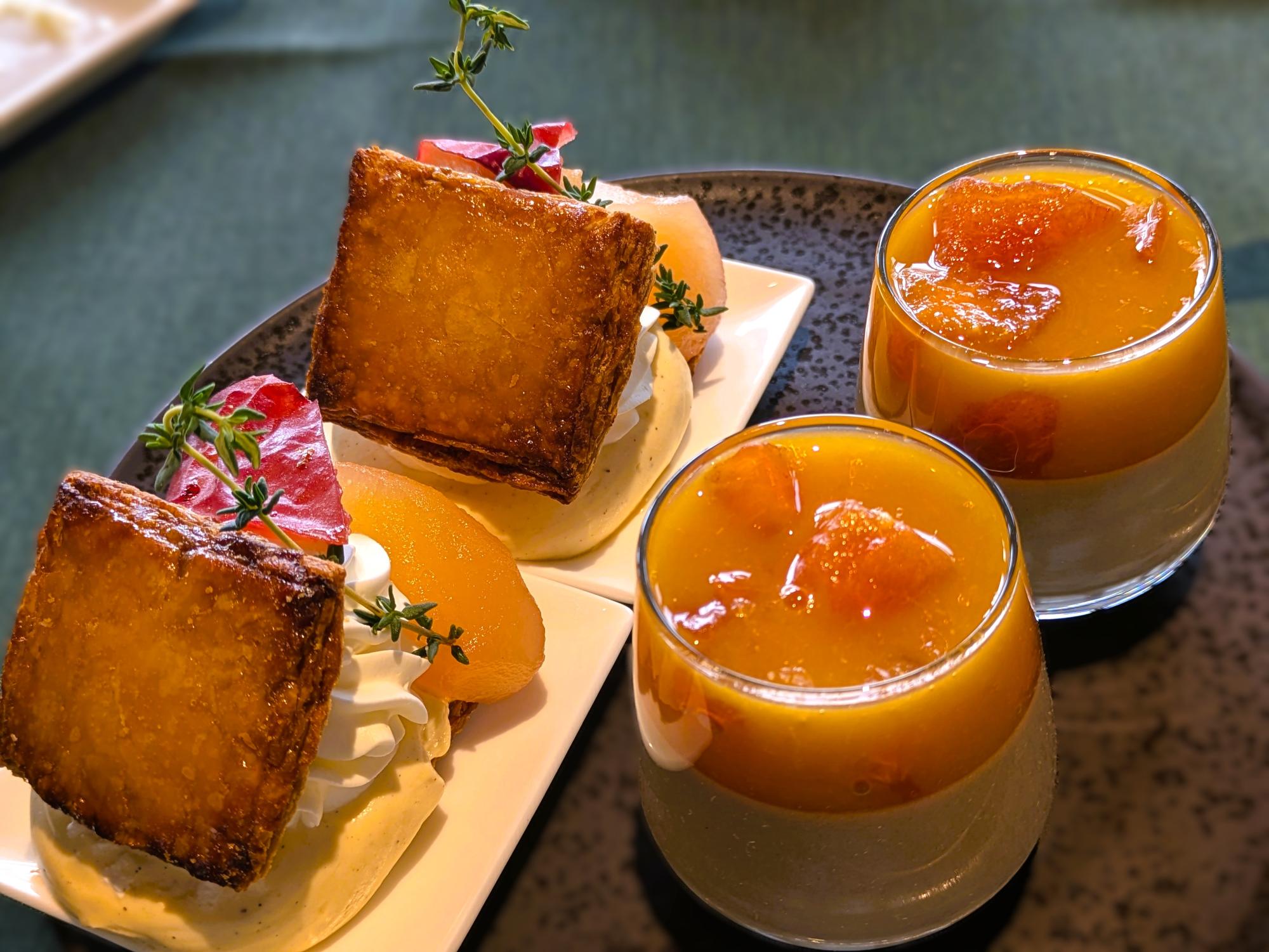 香ばしい焙じ茶の風味が広がるミルクプリンに、温州みかんのソースを合わせた一品。 やさしい甘さと柑橘の爽やかな酸味が溶け合い、ひと口ごとにほっとする温もりを感じさせてくれます。 トップに添えられた柿との調和も見事で、和の素材が織りなす冬らしい味わいが楽しめます。