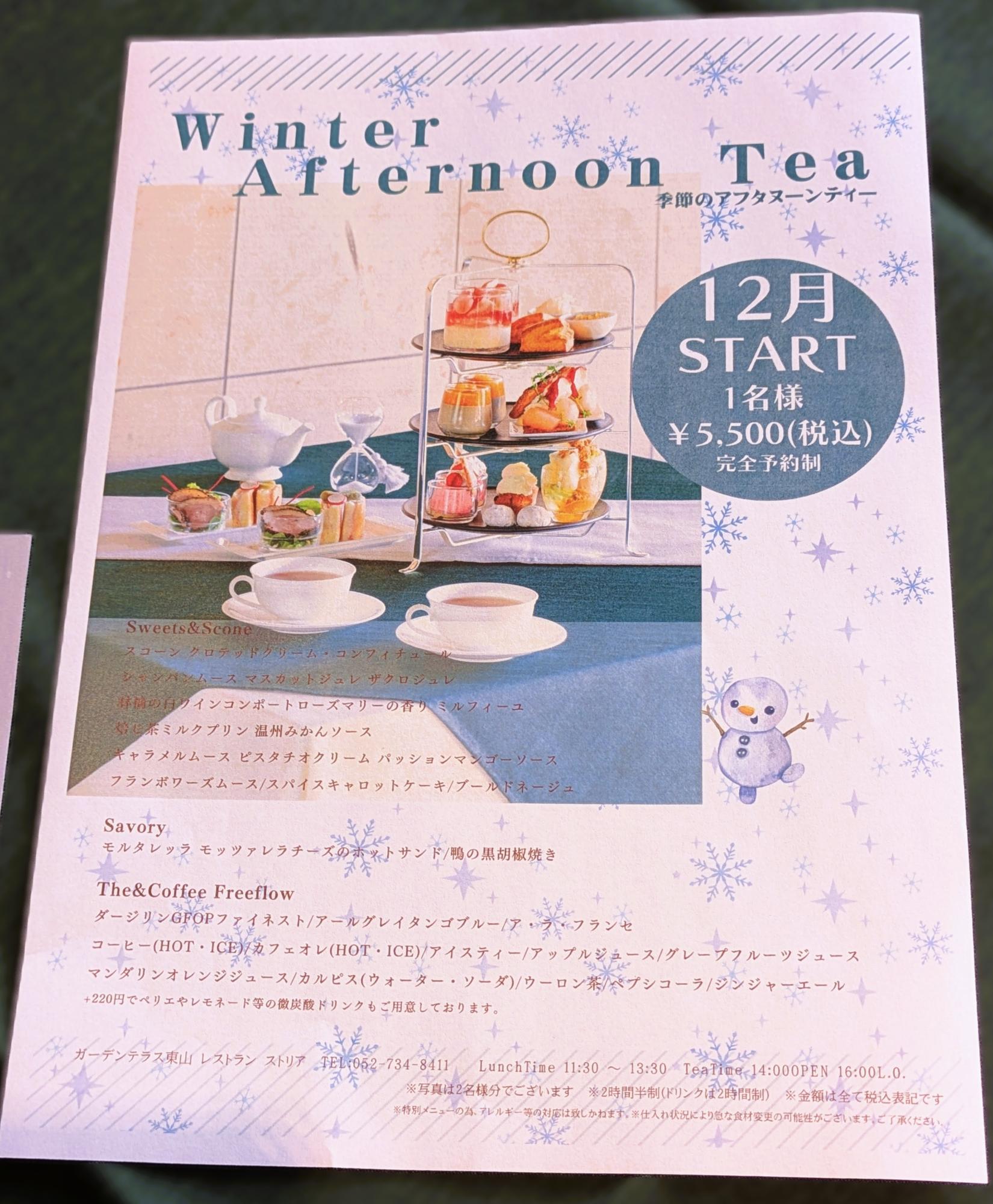 ※訪問時は冬メニューでしたが、今は春のアフタヌーンティーやランチが楽しめる季節になっています。季節ごとに内容が変わるため、最新情報は公式サイトをご確認ください。