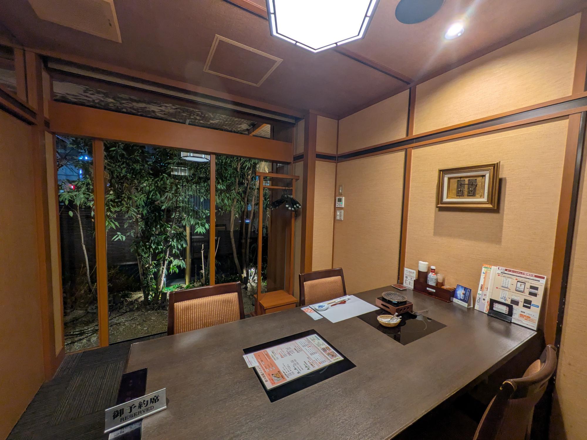 通されたのは、窓越しに小さな庭がのぞく、趣のある個室。木のぬくもりに包まれながら、ゆったりとした時間が流れます。