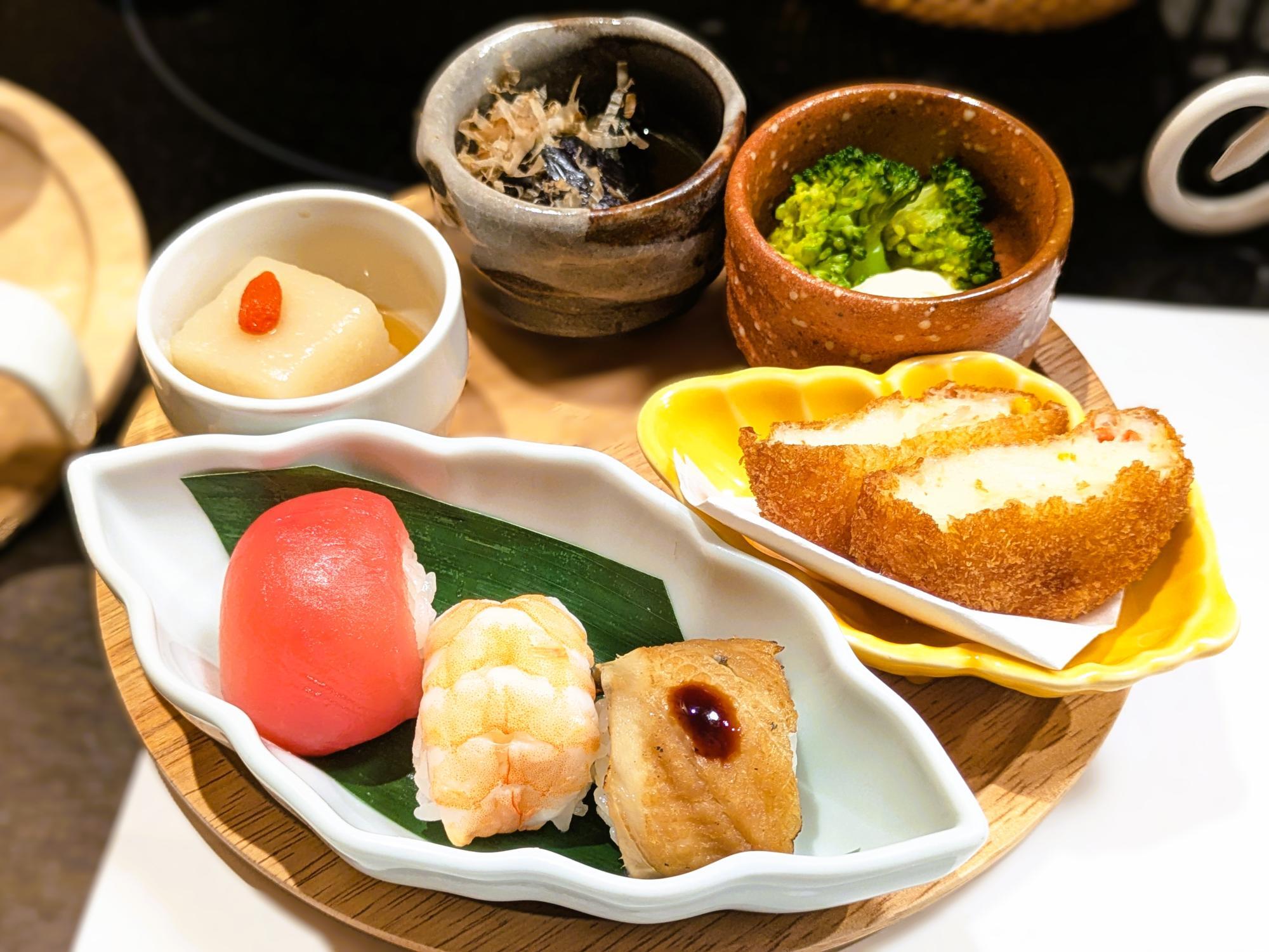 そして下段には、ひと口サイズのお寿司や前菜がバランスよく盛られていて、甘いものが得意でない方にも嬉しい構成です。