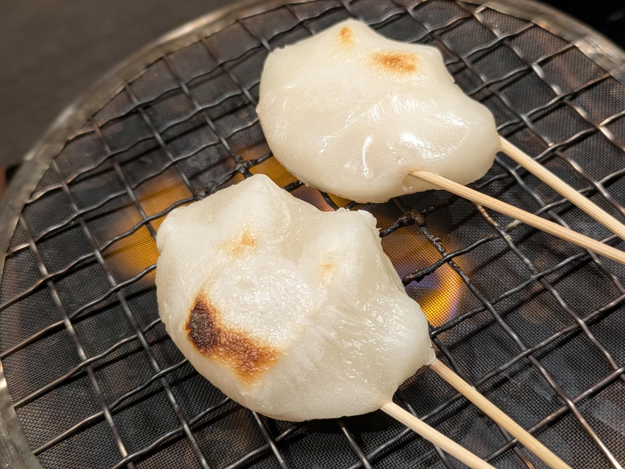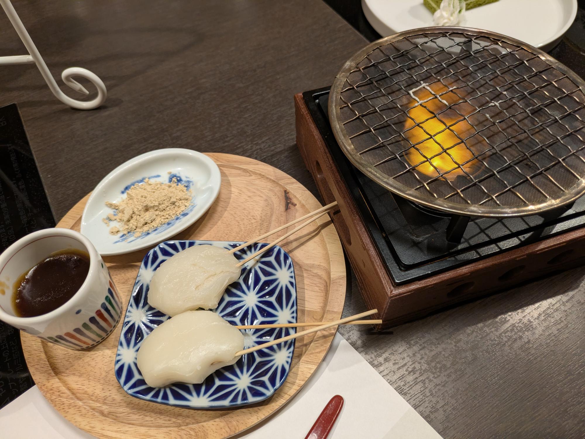 お餅を網に載せると、じわじわと香ばしい焦げ目がついてきます。 裏返して、お好みの焼き加減になったら、きな粉やみたらしのタレをたっぷり絡めて。 焼きたてならではの香りと食感が加わることで、より一層おいしさが引き立ちます。 自分で焼くというひと手間が、アフタヌーンティーの時間をより特別なものにしてくれます。
