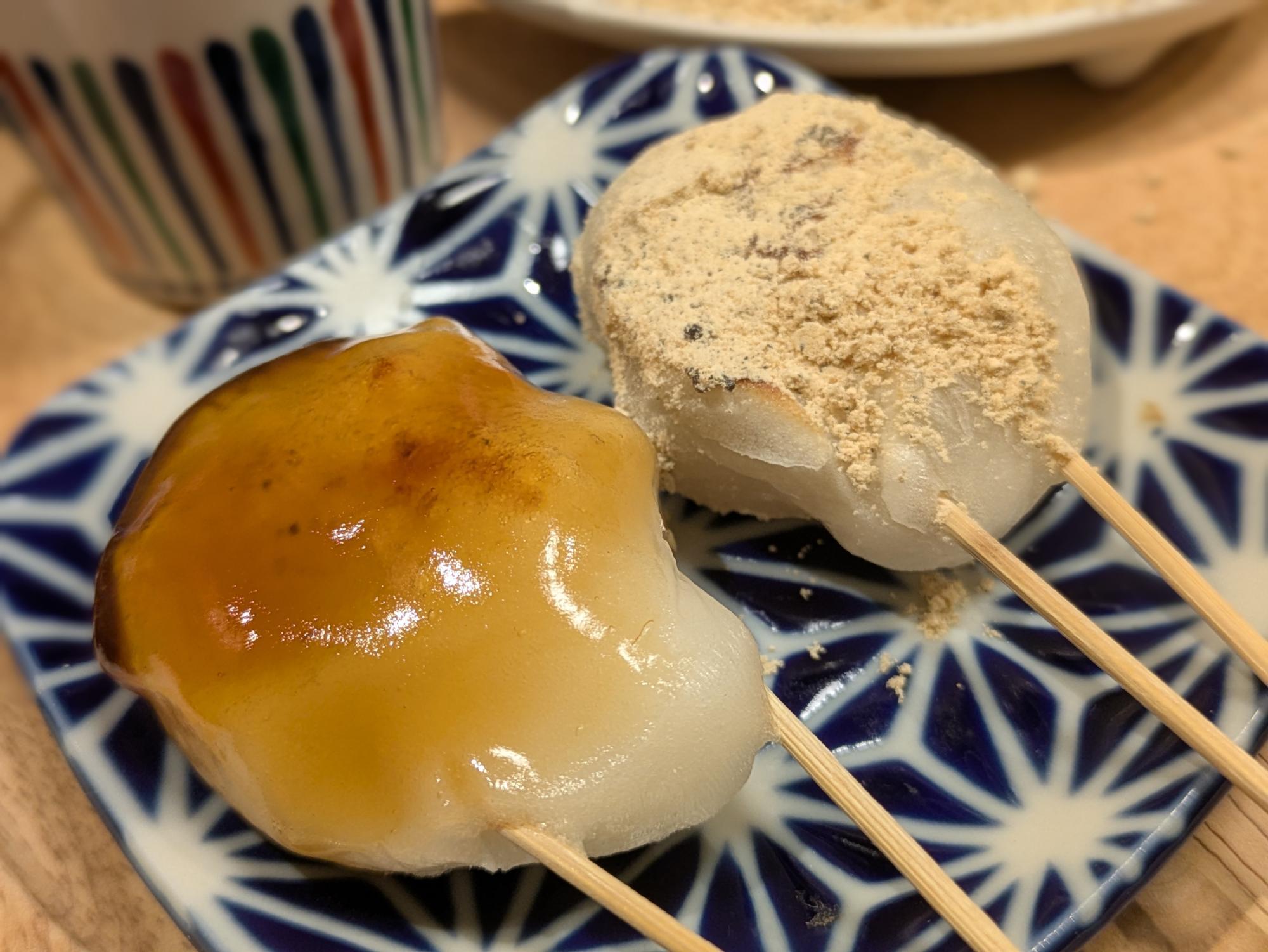 網の上でじっくり焼いたお団子は、外は香ばしく、中はもっちり。 焼き上がったら、みたらしの甘じょっぱいタレをとろりとかけたり、きな粉をたっぷりまぶしたり。 それぞれの味わいが引き立つように仕上げられていて、どちらも甲乙つけがたい美味しさです。