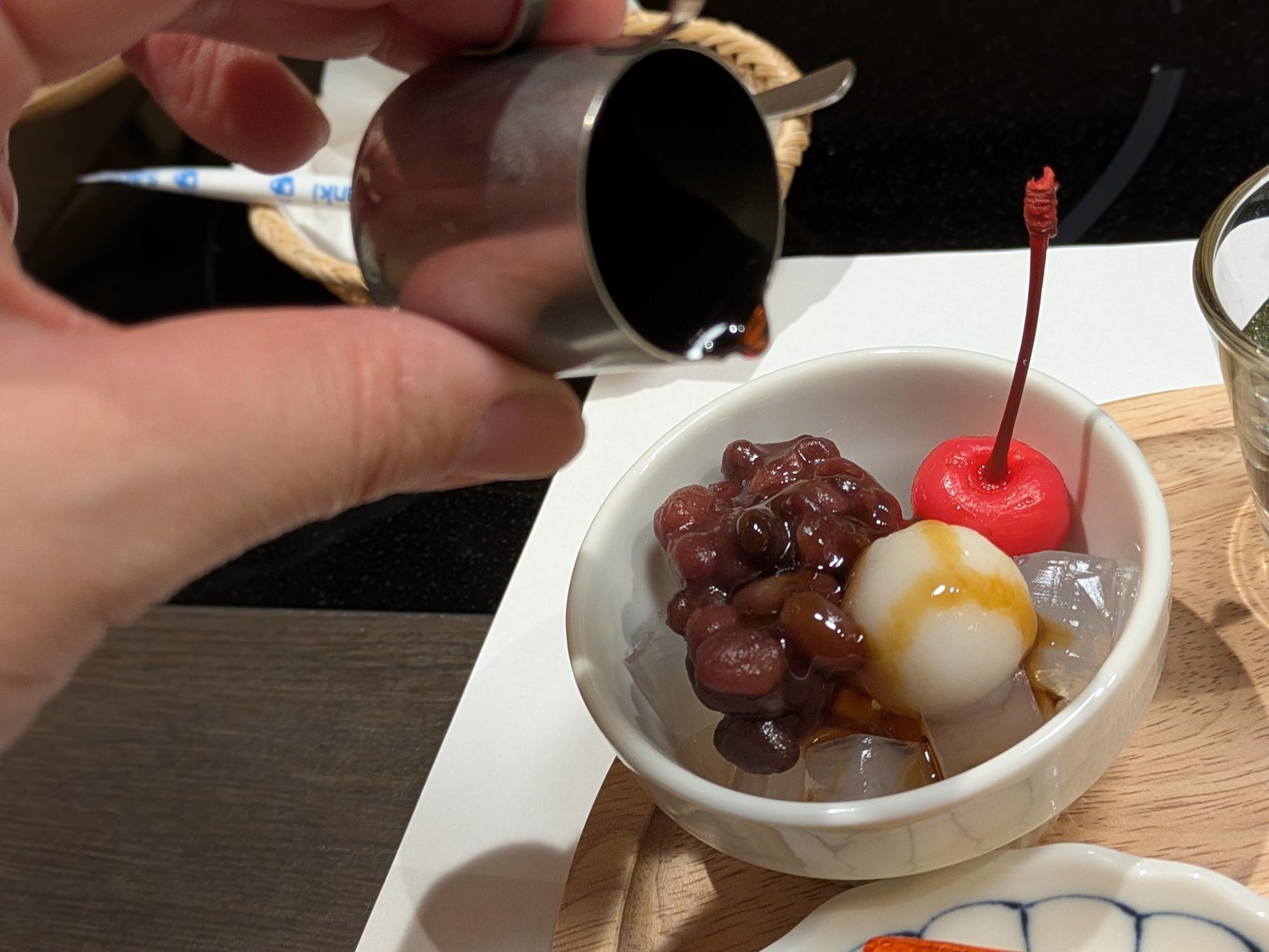 三の段の甘味のひとつ、白玉あんみつは、見た目の涼やかさと食感のコントラストが楽しい一品。 もちもちの白玉に、黒蜜のコクが絡み、最後のひと口まで飽きずに楽しめます。