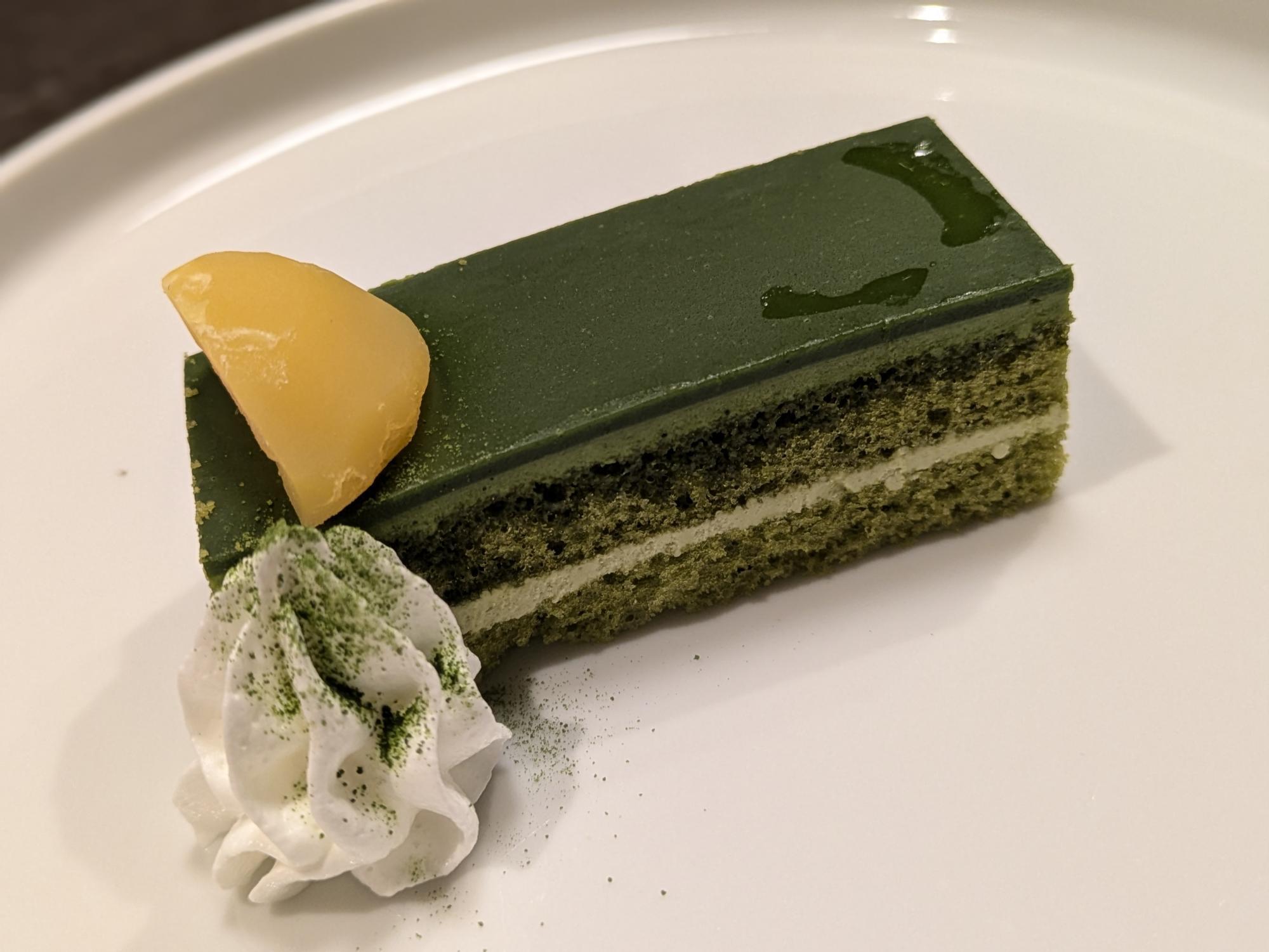 「森半抹茶オペラケーキ」は、 抹茶のほろ苦さとクリームのまろやかさが層になって重なり、口に運ぶたびに風味が広がる上品な一品。 甘さは控えめで、後味はすっきり。見た目も美しく、アフタヌーンティーの中でも印象に残る存在です。