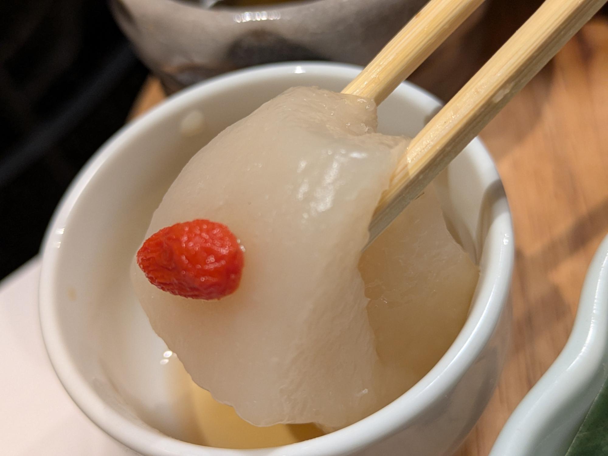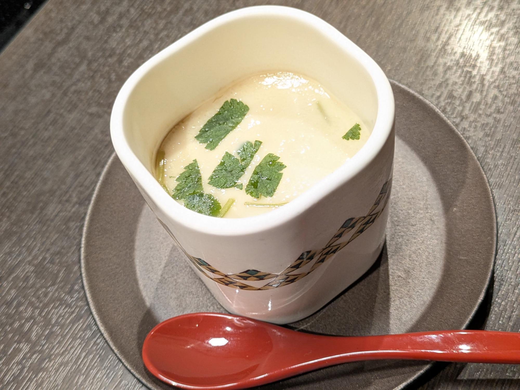 「聖護院かぶ豆腐」は、やさしい甘みともちもち食感がクセになる、素朴ながらも印象に残る味わいでした。どの一品も主張しすぎず、全体のバランスを大切にしているのが印象的です。