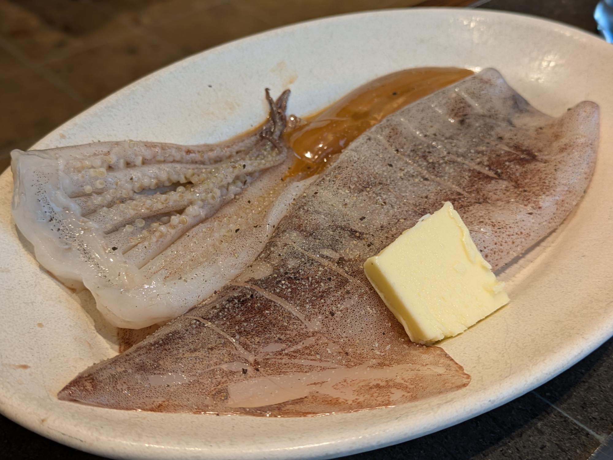 まず最初にいただいたのは、「季節のおすすめメニュー」から「いかの丸焼き(肝醤油)」(税込1,540円)です。