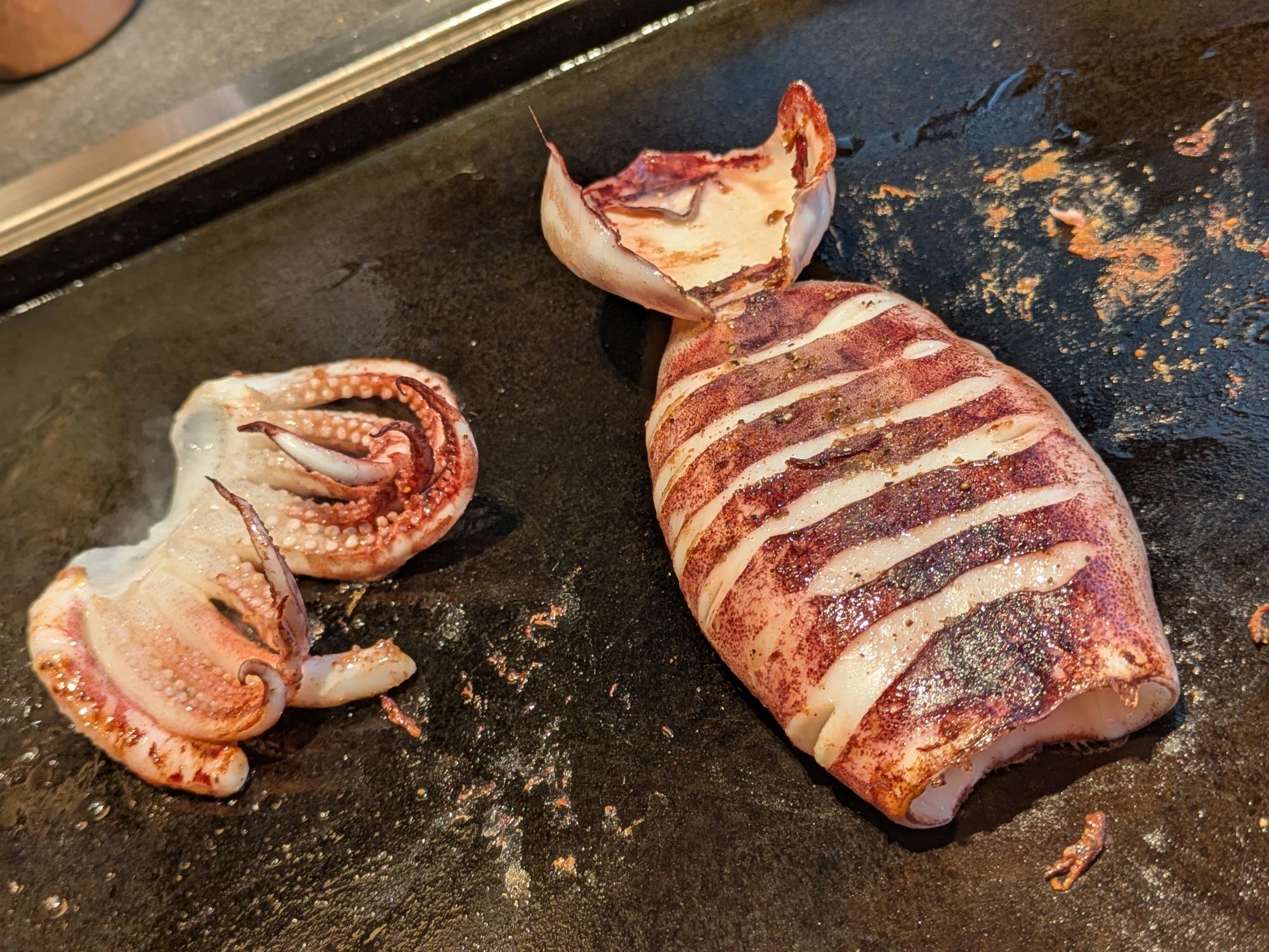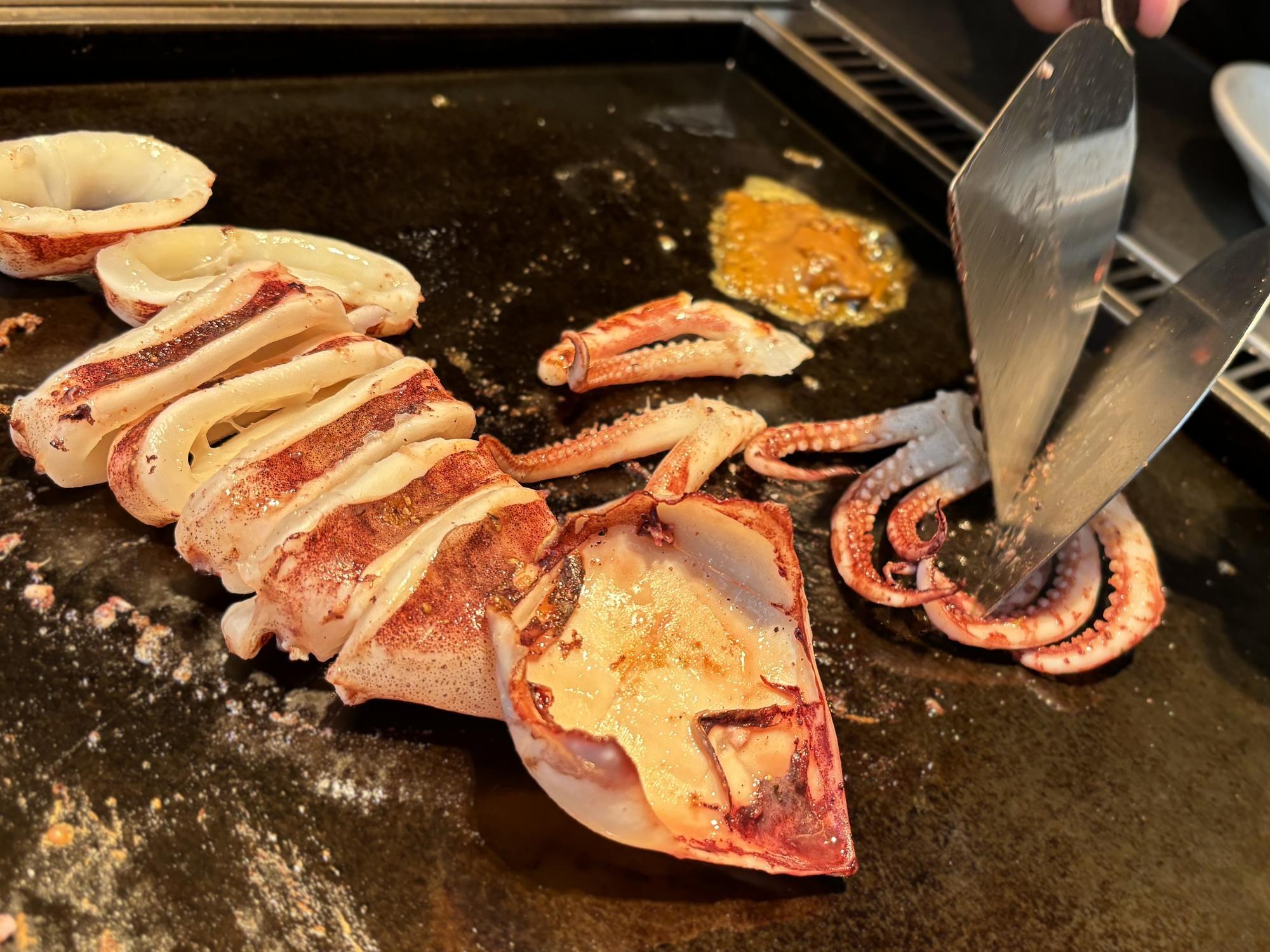 刺身でも食べることができる鮮度のいかが鉄板の上にのせられた瞬間、じゅわっと音を立てて焼き始め、香ばしい匂いがふわりと立ちのぼります。
