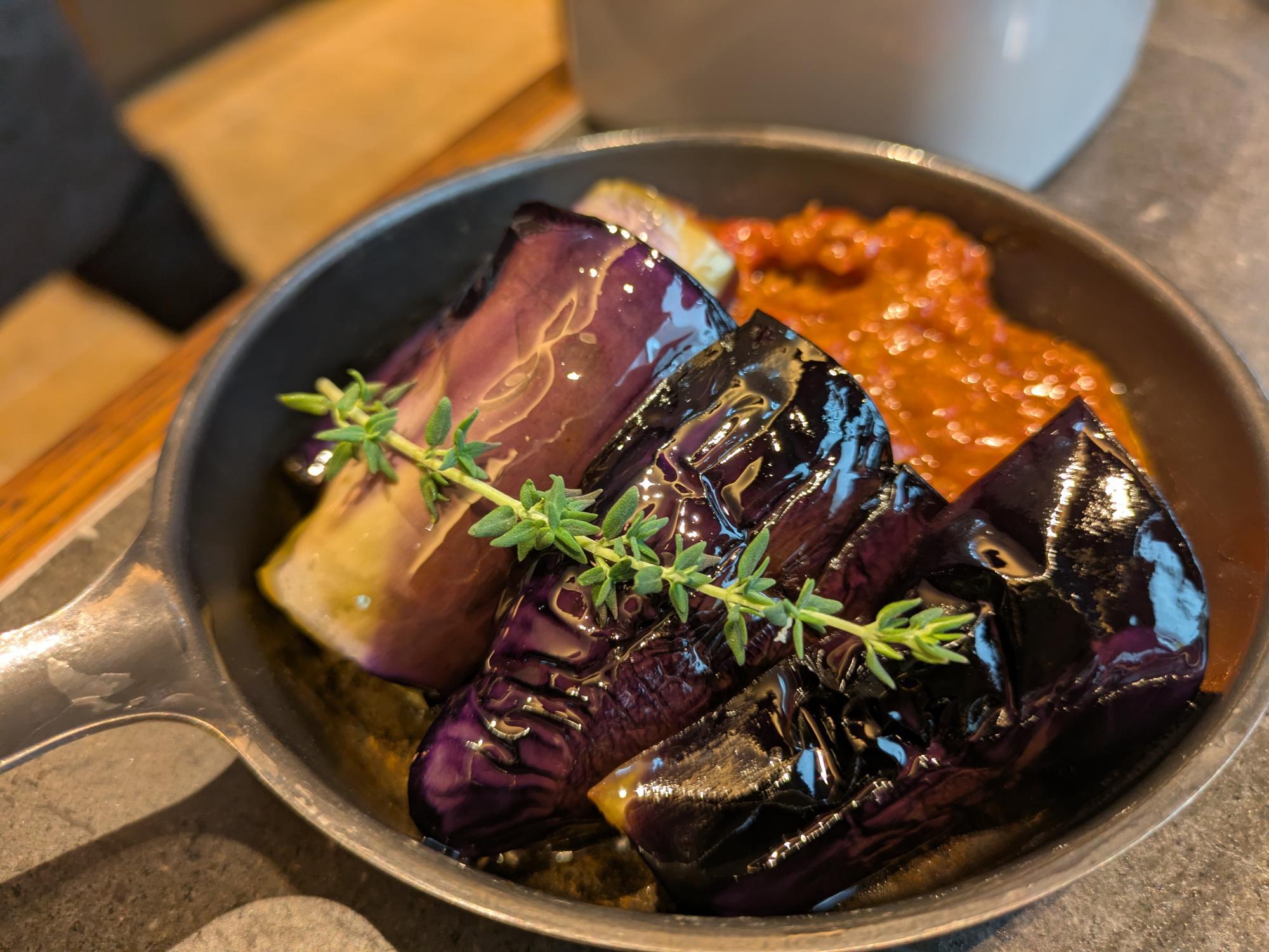 次にいただいたのは、「南仏風ラグーと茄子のスキレット焼き 濃厚チーズ」(税込990円)です。