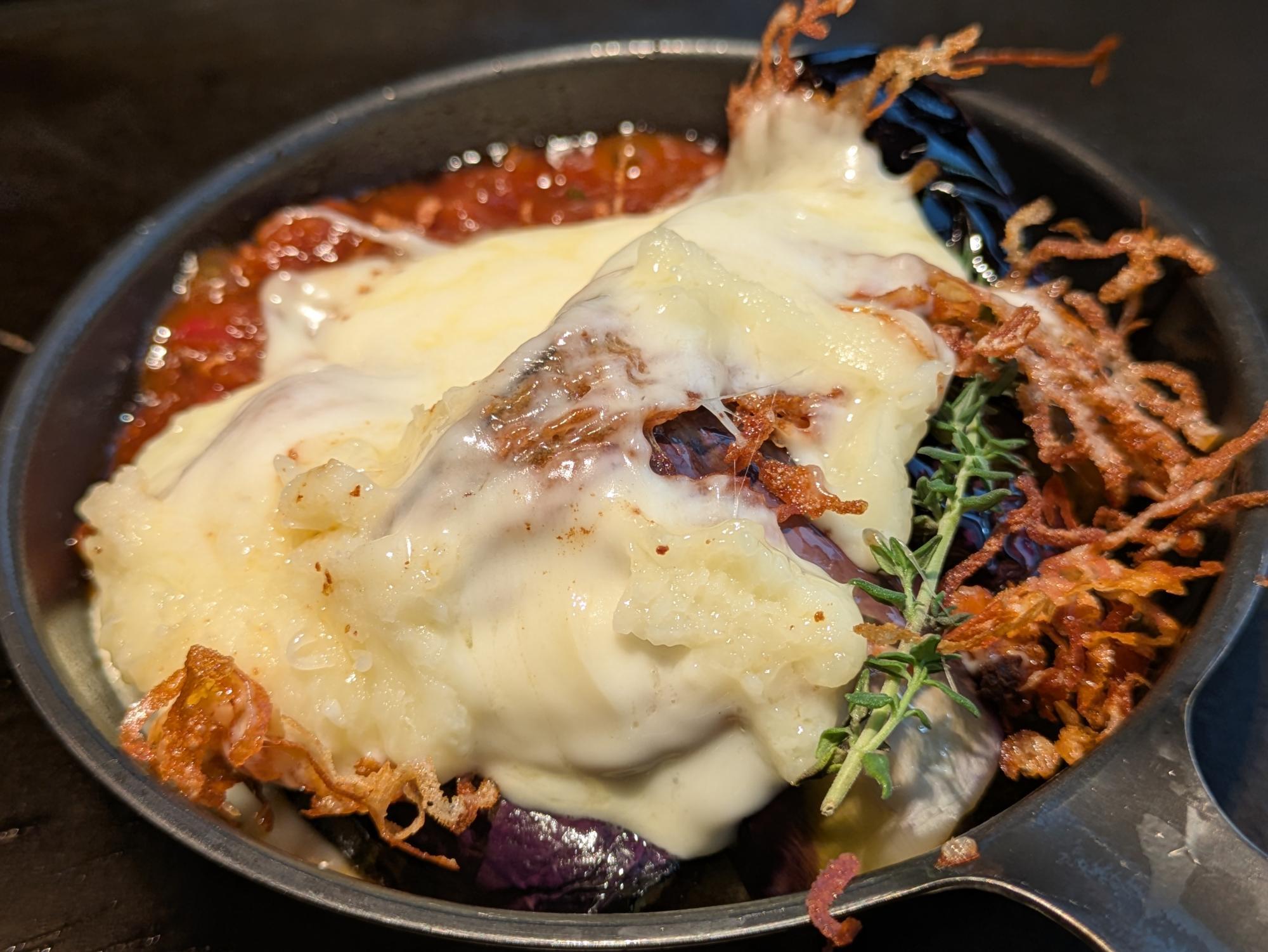 焼きたてのモッツァレラの伸びの迫力は、思わず目を奪われるほど。 とろりとした質感と香ばしい焦げ目が重なり、スキレットの上でひときわ存在感を放ちます。 ここはまさに写真映えの瞬間。 濃厚なモッツァレラの旨みはもちろん、じゅわっと甘みを増した茄子そのものがとても美味しく、ラグーとの一体感も抜群です。
