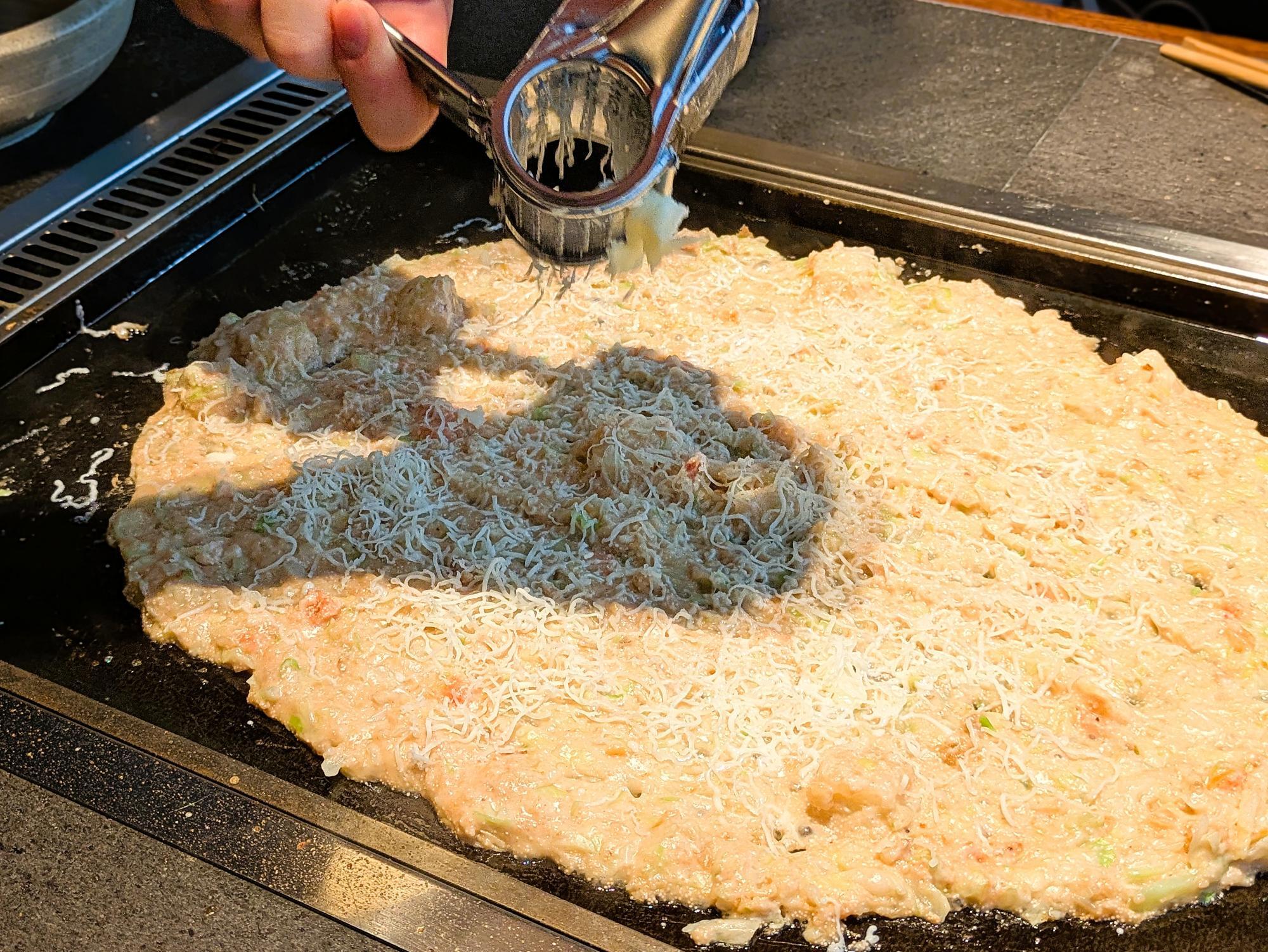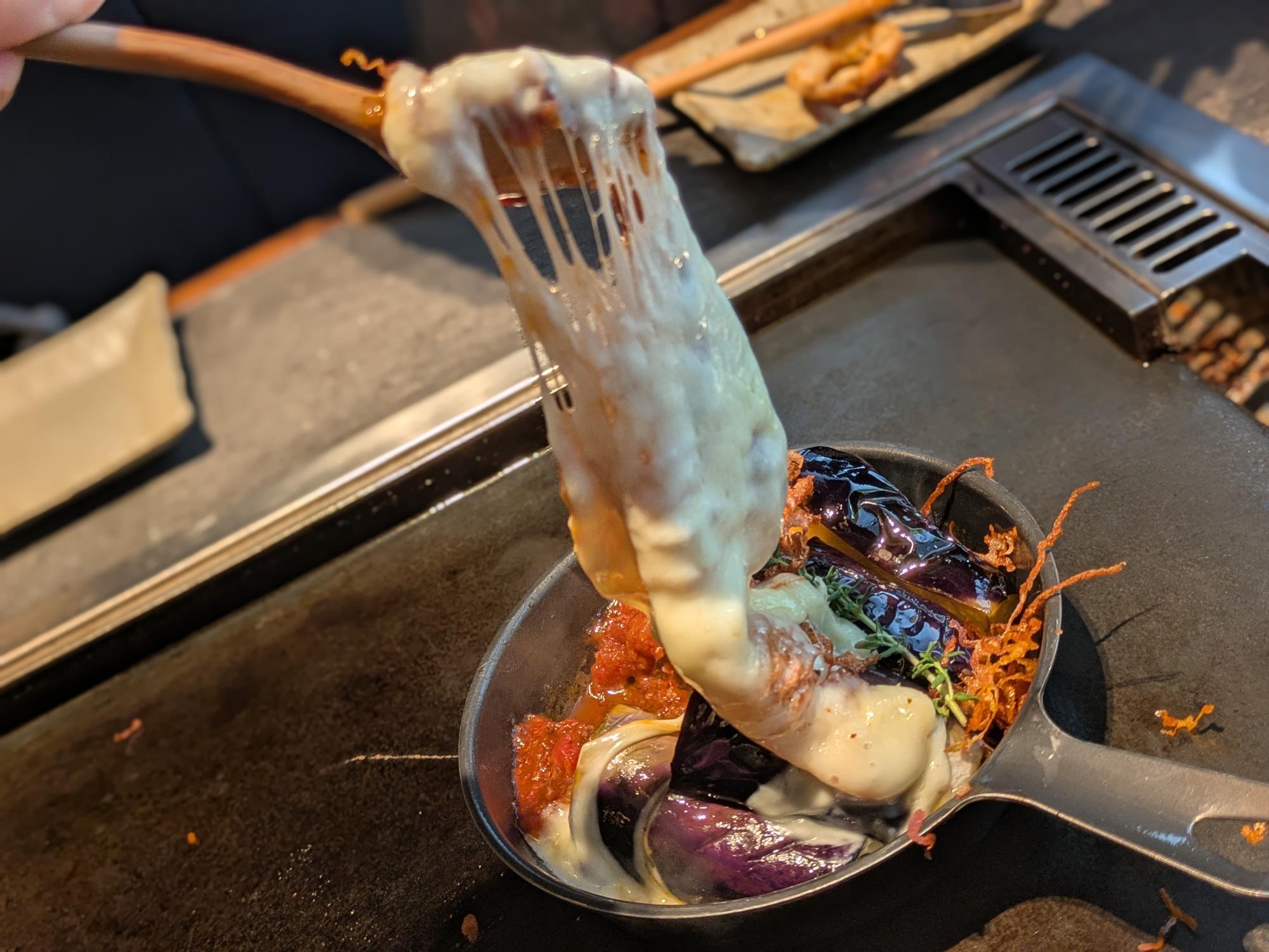 仕上げには、鉄板で香ばしく焼き上げたモッツァレラチーズを、とろりと重ねて完成。 熱々の具材にモッツァレラが絡み合い、見た目にも食欲をそそる一皿に仕上がります。