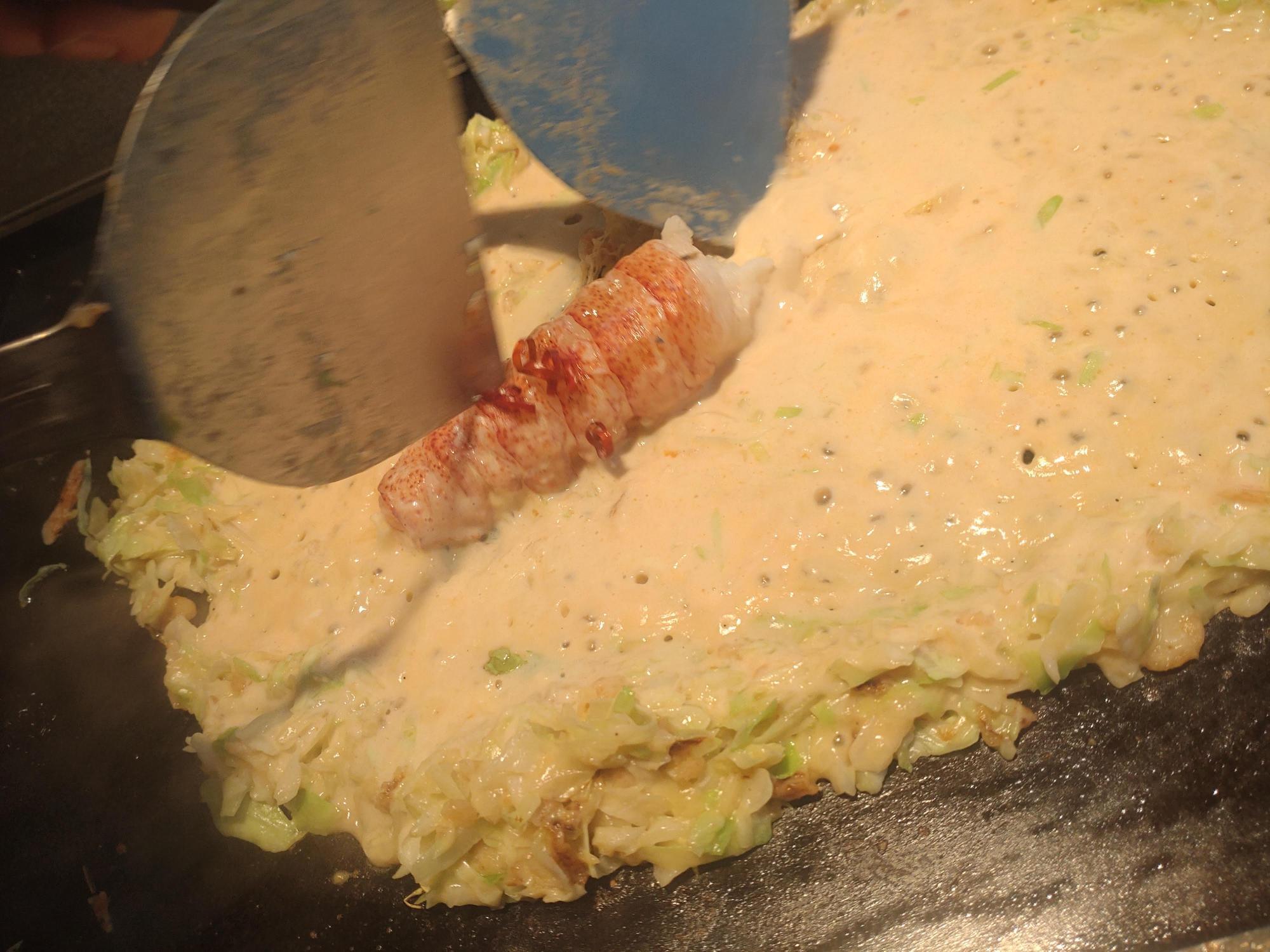 オマール海老の濃厚な旨みが、もんじゃのとろりとした生地にじんわりと染み渡ります。 鉄板の上で焼かれることで、ビスクの香りがふわりと立ちのぼり、まるでフレンチのような贅沢さ。 それでいて、もんじゃならではの親しみやすさと、香ばしい食感がしっかりと残っています。