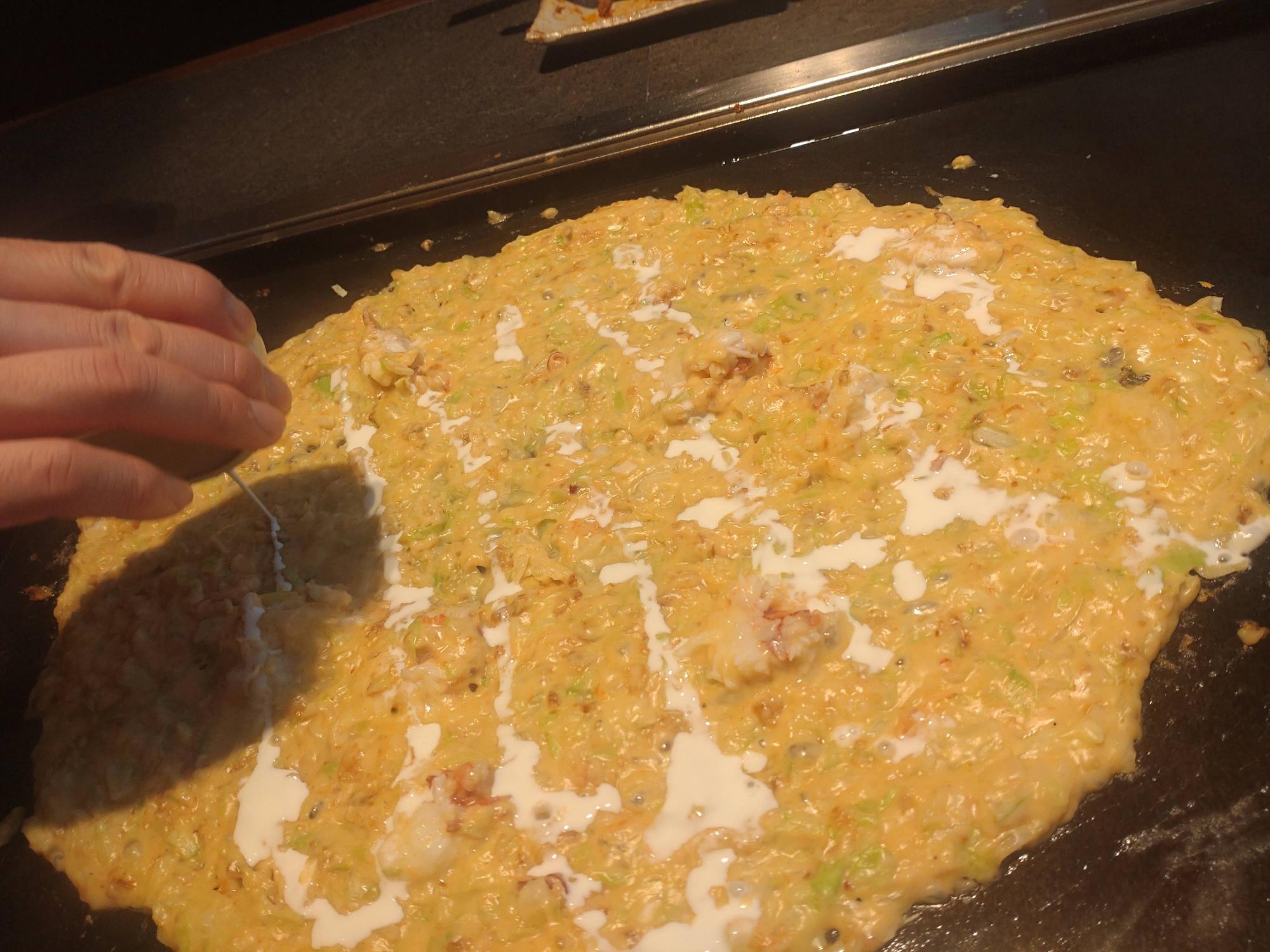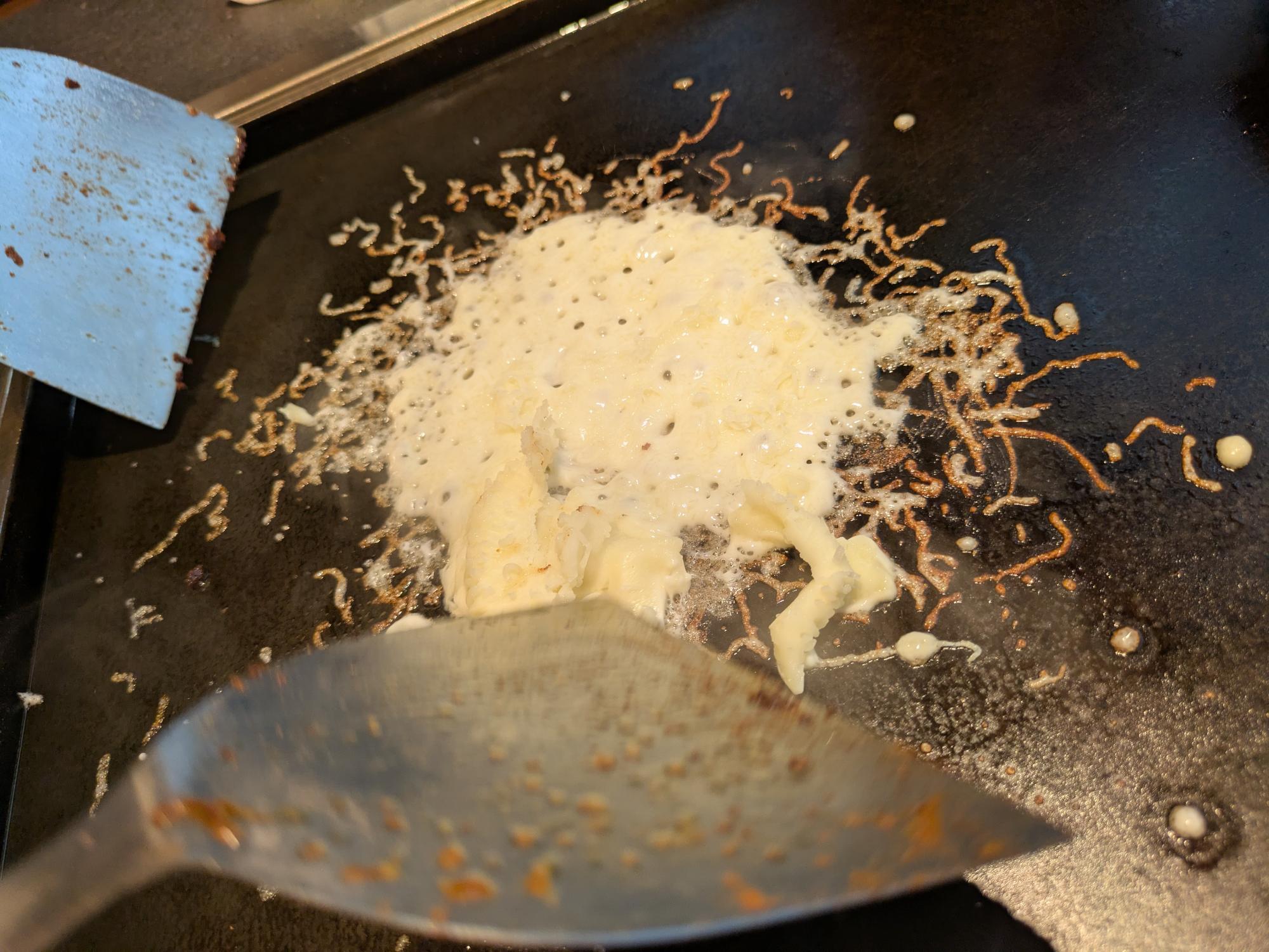 仕上げには、生クリームを加えて濃厚さをプラス。 鉄板の熱でとろりと溶け、生地とビスクがなめらかに一体となっていきます。 その瞬間、香りがふわっと広がり、見た目にも味わいにも“特別感”が増していくのがわかります。 まさに、最後のひと手間が極上の一皿を完成させる——そんな贅沢な仕上がりです。