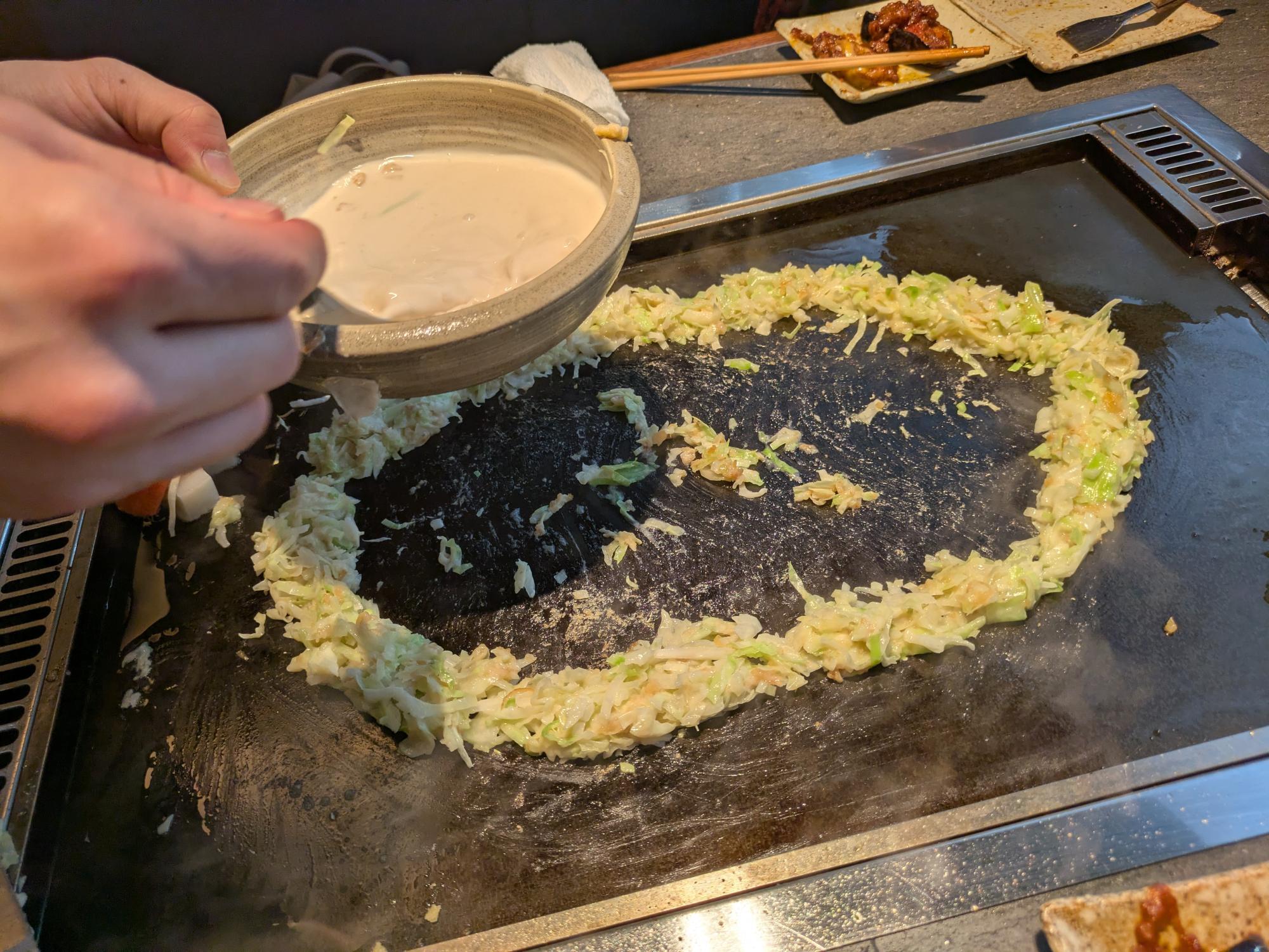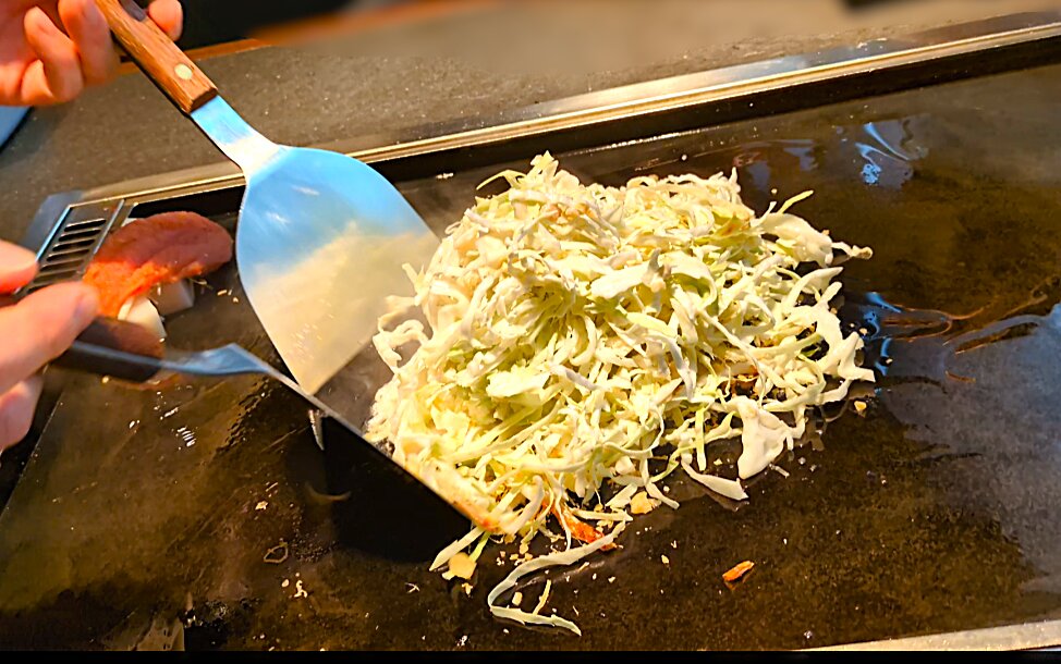 キャベツは鉄板の上で刻んでいくのが「MOHEJI」流。 じゅわっと音を立てながら細かくなるにつれて、熱が入り、甘みがぐっと引き立っていくのだそうです。 その工程を目の前で見られるのも、鉄板料理ならではの楽しみ。 香ばしさとともに、キャベツのやさしい甘みが料理全体に広がっていきます。