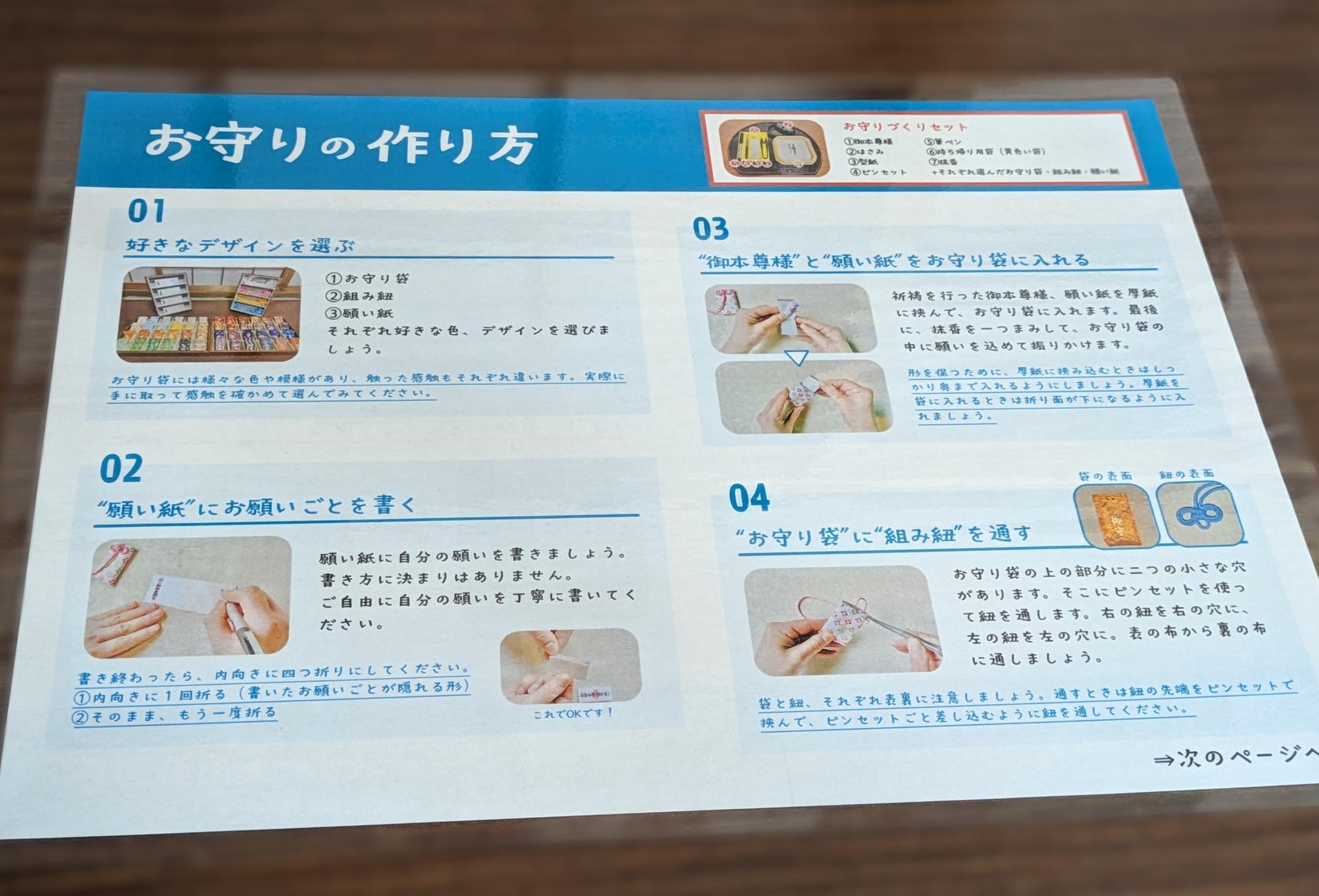 お気に入りの組み合わせが決まったら、お守り作りセットが用意された机へ。 そこで、願い紙にそっとお願いごとを書き込みます。