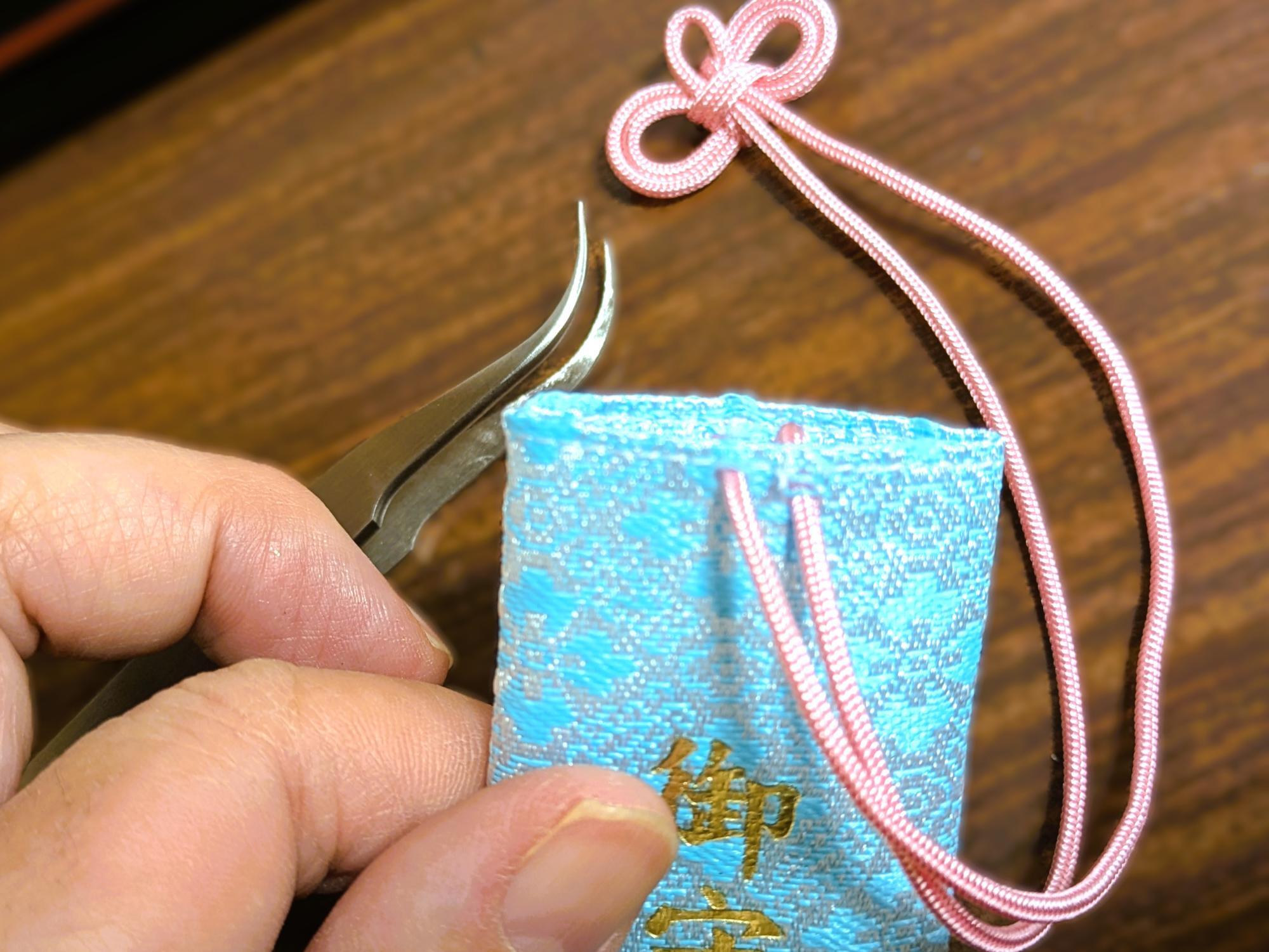 仕上げの工程では、ピンセットを使って組み紐をお守り袋に通し、形を整えていきます。 細かい作業もありますが、わからないことがあればスタッフの方が丁寧に教えてくれるので、初めてでも安心です。