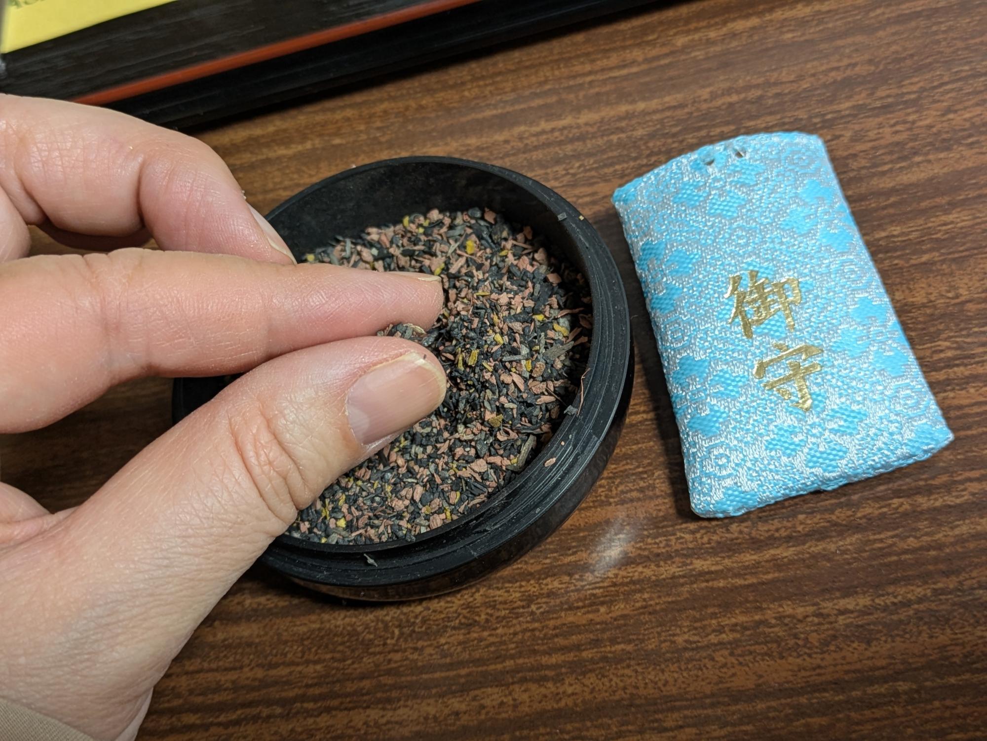 マニュアルに沿って、御本尊様、願い紙をお守り袋に入れます。そして、抹香を一つまみして、お守り袋の中に願いを込めて振りかけます。