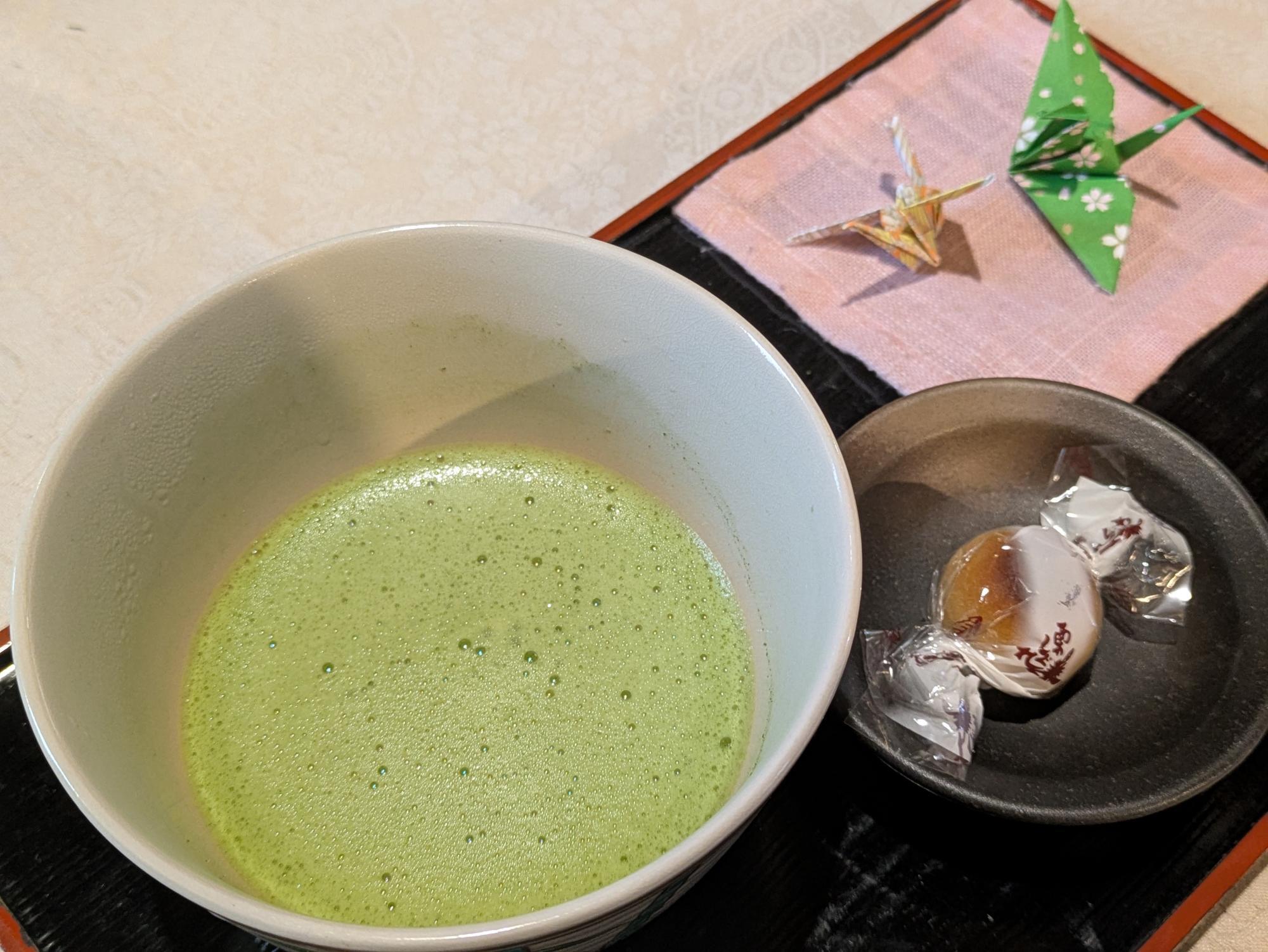 御祈祷は、毎時00分ちょうどに始まります。 開始までの待ち時間には、お抹茶(またはお茶)とお茶菓子がふるまわれ、 静かな空気の中で、心を落ち着けながらその時を待ちます。
