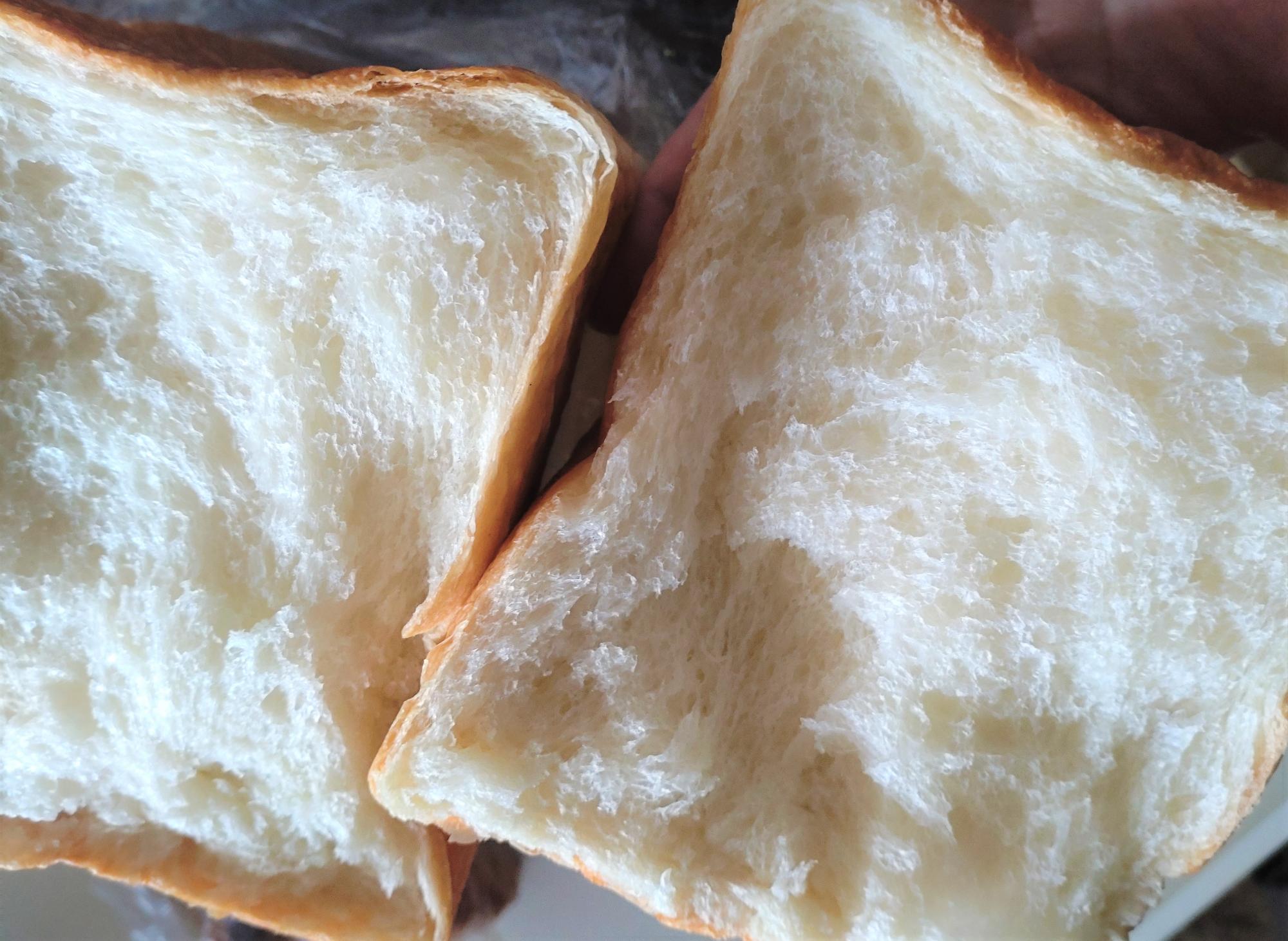 湯種(小麦粉に熱湯をかけて糊化させたもの)を使用しているので、もちもちでしっとりした食感で、指で押しても、戻ってくる力が強いです。