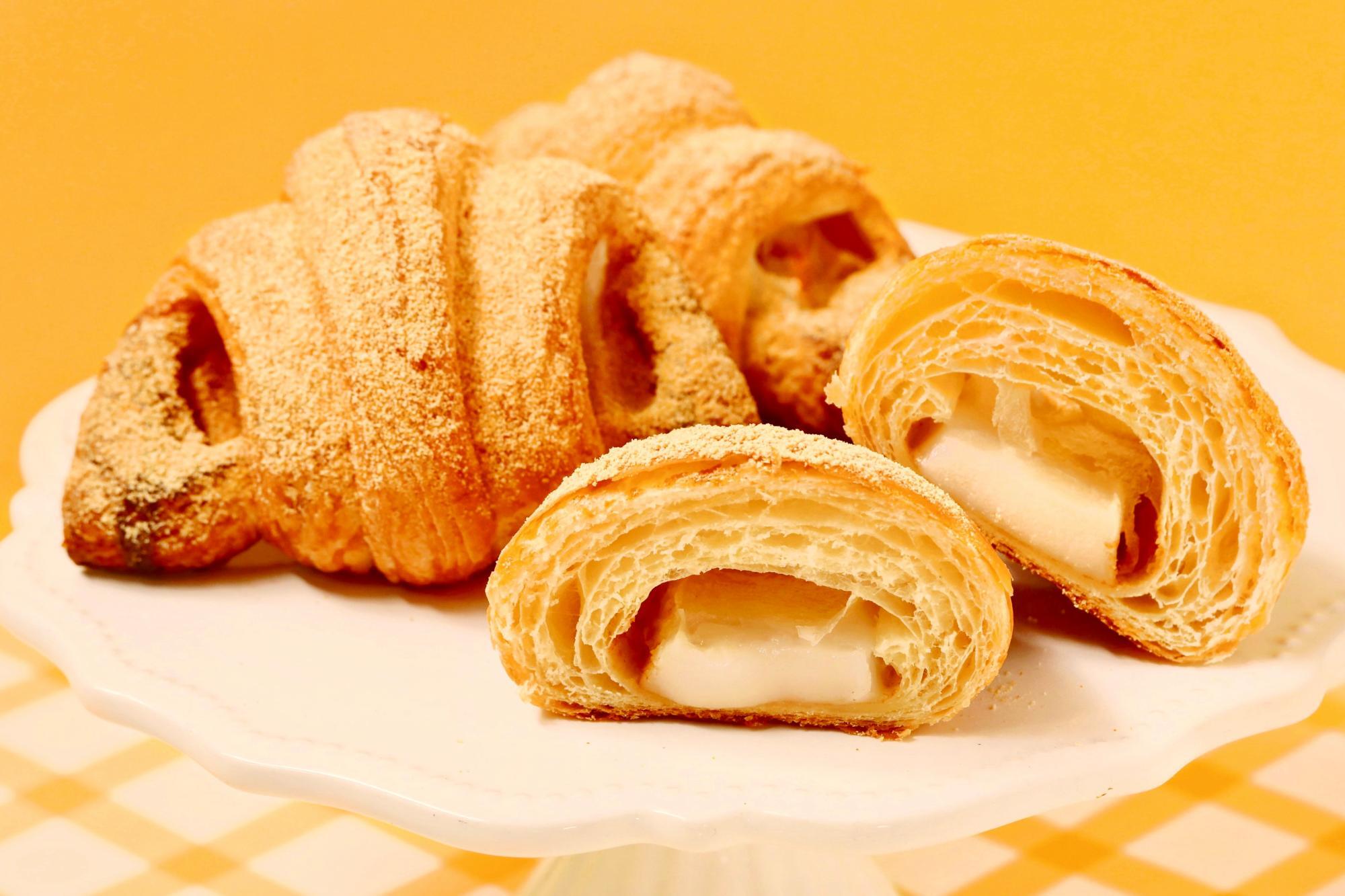 クロワッサンのサクサク感と、餅ののびるような弾力を組み合わせた新食感が特徴で、「チョコ」と「きなこ」の2種類が登場します。どちらもデニッシュ生地を使用しており、外は香ばしく、中はもっちりとした食感が楽しめます。