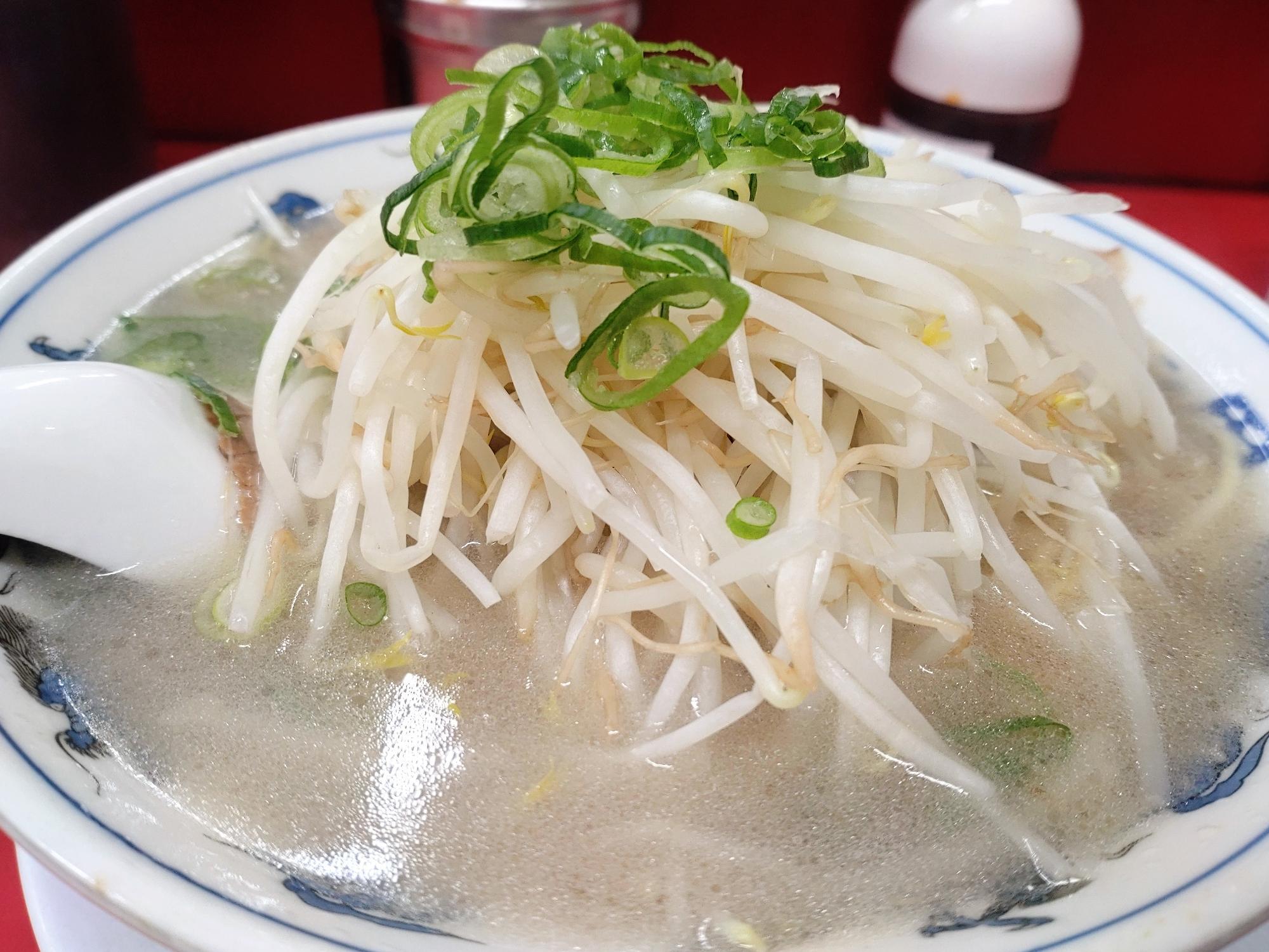 麺の上には、野菜(モヤシとネギ)がたっぷり乗っています。