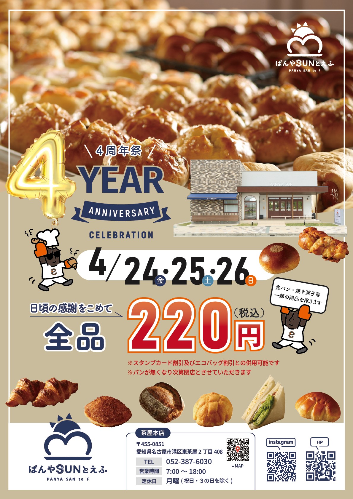 名古屋市港区の「ぱんやSUNとえふ 茶屋本店」(運営:フジサービス株式会社)が、オープン4周年を記念して 店内パン全品220円(税込) の特別イベントを開催します。