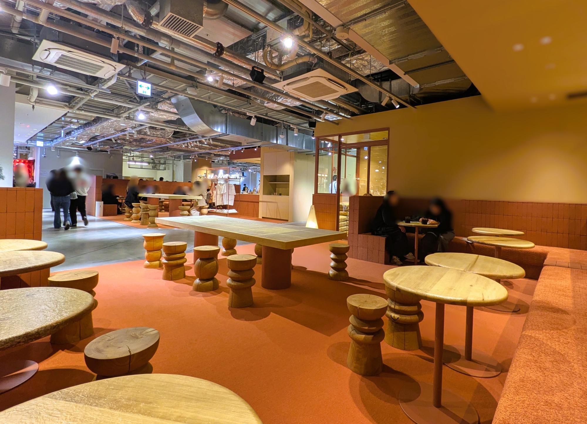 円形カウンターや背面壁に赤土のレンガを使用し、足元にはカフェでは珍しい全面カーペットを敷くことで、訪れた瞬間からPhiの世界観に包まれるような落ち着いた雰囲気を演出しています。木の温もりを感じるスツールやテーブル、クロワッサン生地のような質感を持つFRP素材の什器が、空間にやさしいリズムと遊び心を添えています。