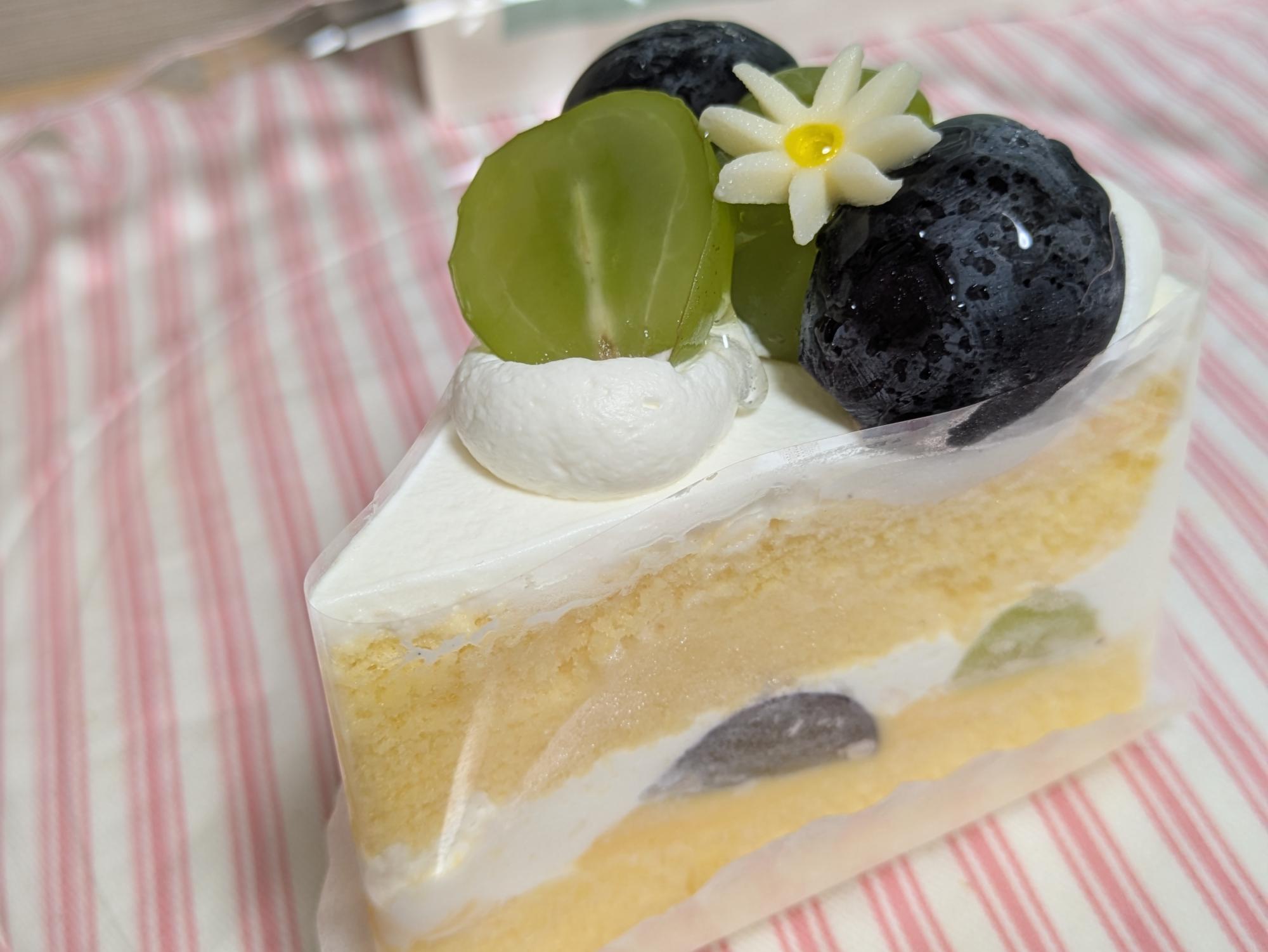 ふわふわでしっとりとしたスポンジと、軽やかなホイップクリームの間に、国産のシャインマスカットとナガノパープルがサンドされています。