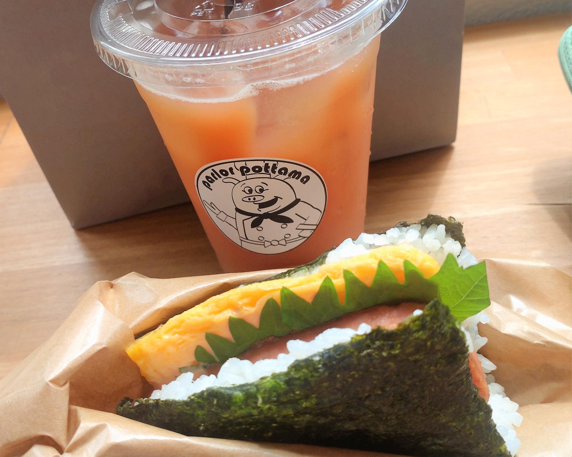 ぽったまのポークたまごおにぎり「オリジナル」(330円)とグァバジュース(320円)のセット写真。 グルメ