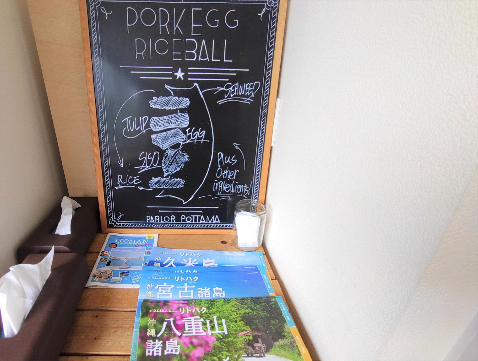 沖縄の観光地のパンフレットやポークたまごおにぎりのレシピのチョークアートが飾られています。