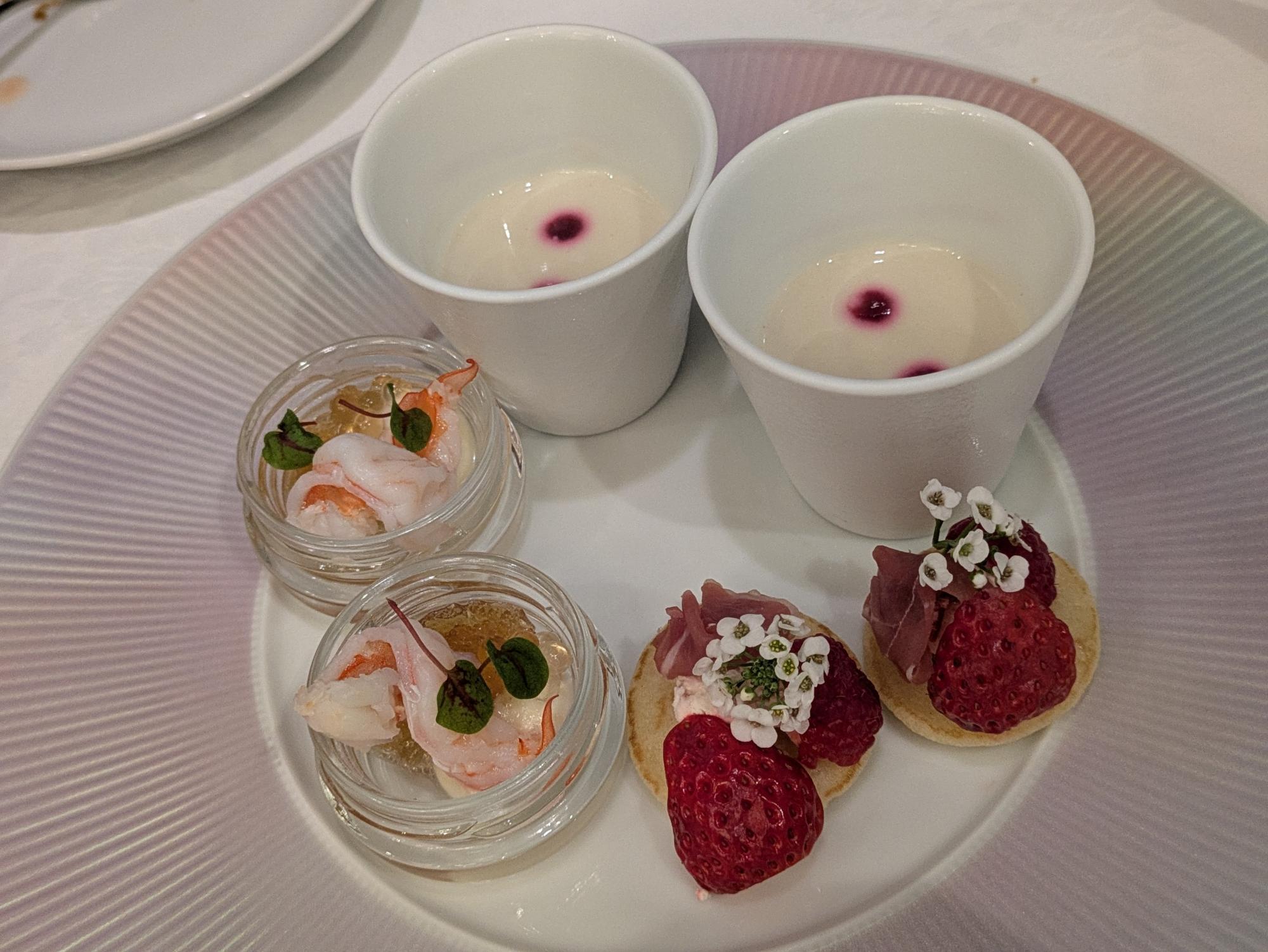 シャンパンジュレのすっきり感といちごの甘酸っぱさが重なり、最初の一口から春らしい軽やかさが広がります。夜の照明に透けるジュレがきらりと輝き、見た目にも華やか。