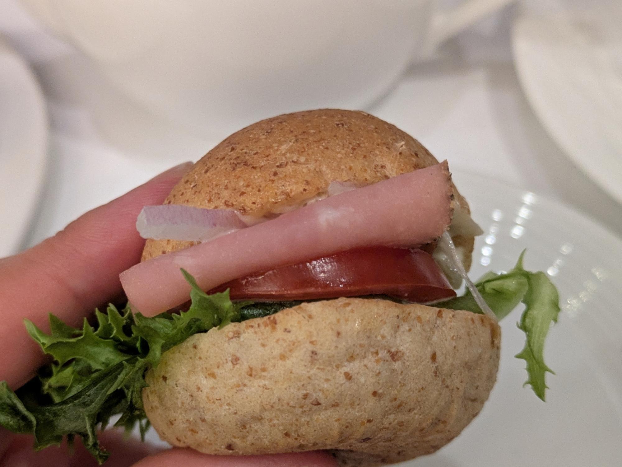 ふんわりとしたバンズに、パストラミ、フレッシュなレタス、トマト、赤玉ねぎが重なり、ひと口サイズとは思えない満足感があります。